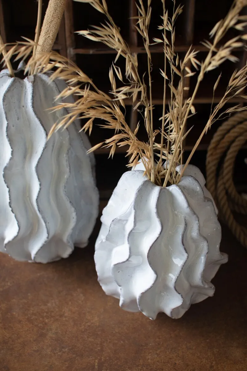 This large white ceramic ruffled vase is a sophisticated way to add style to any room.