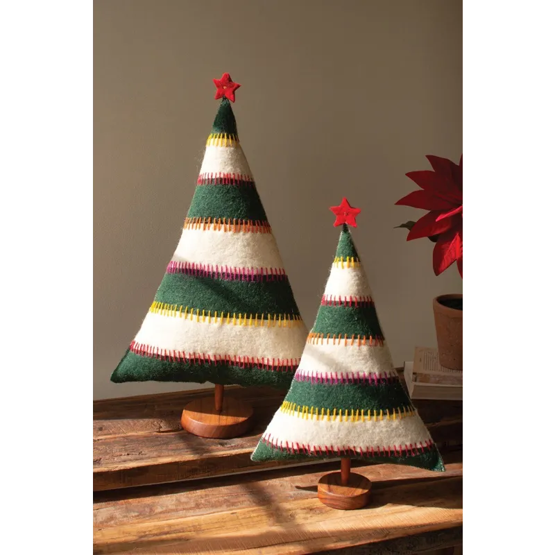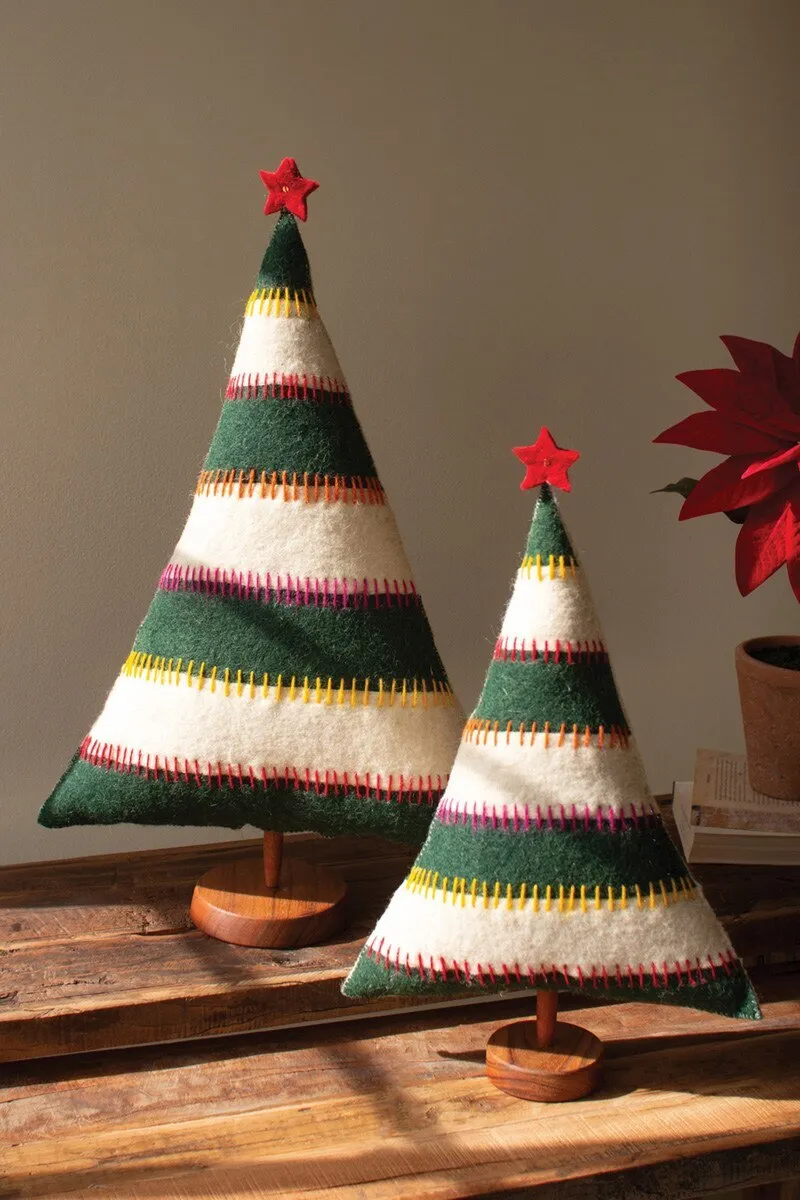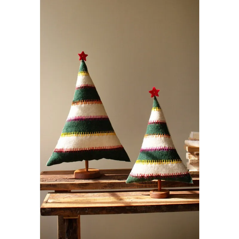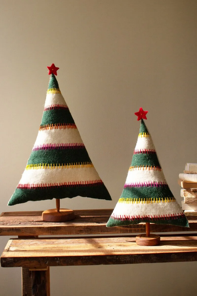 Grab this set of two felt Christmas trees on bases for your holiday party. Striped trees with red stars make great Christmas decor or gifts. The set is made in India.