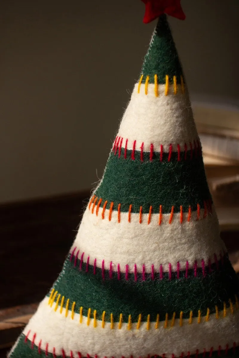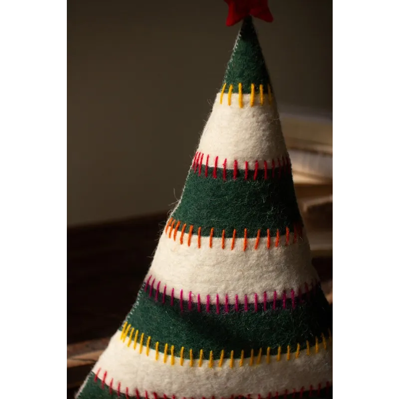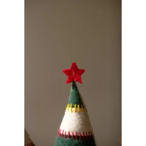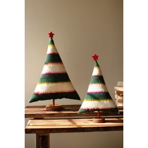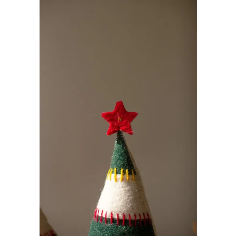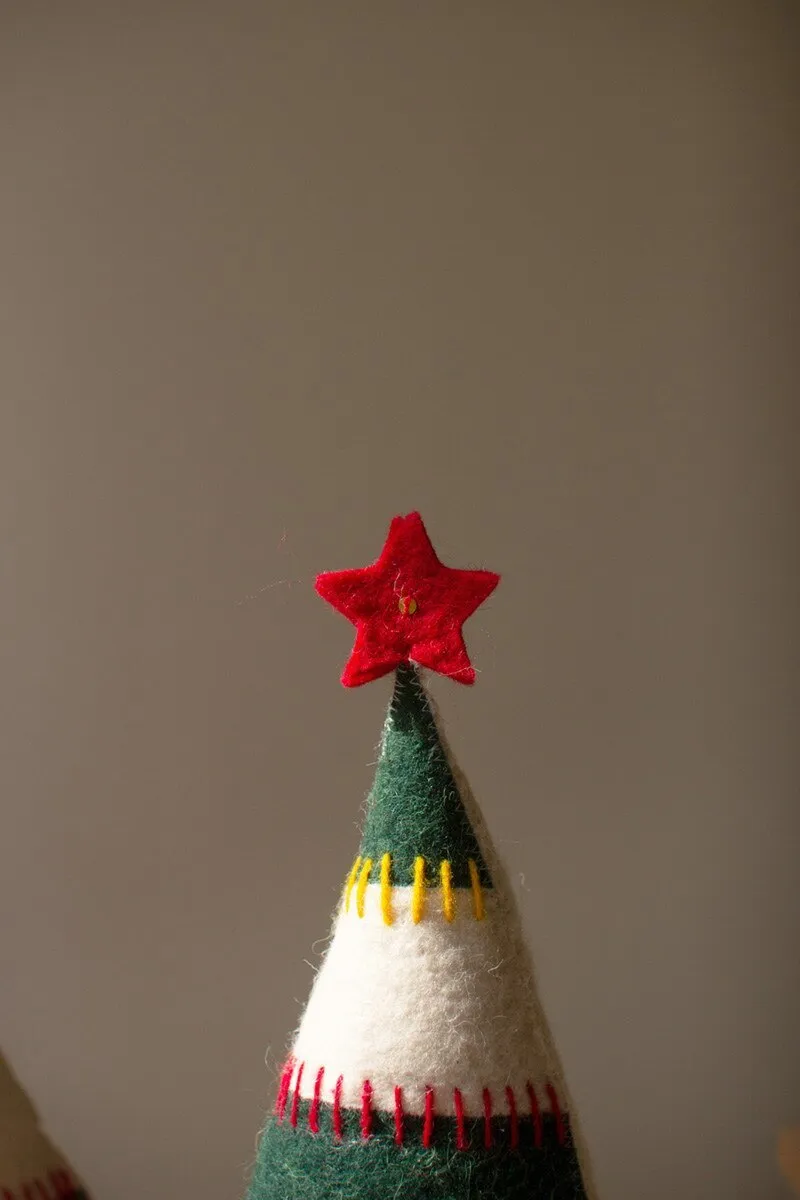 Grab this set of two felt Christmas trees on bases for your holiday party. Striped trees with red stars make great Christmas decor or gifts. The set is made in India.