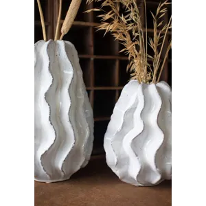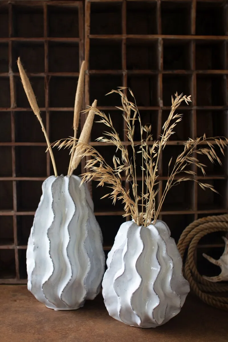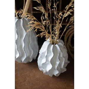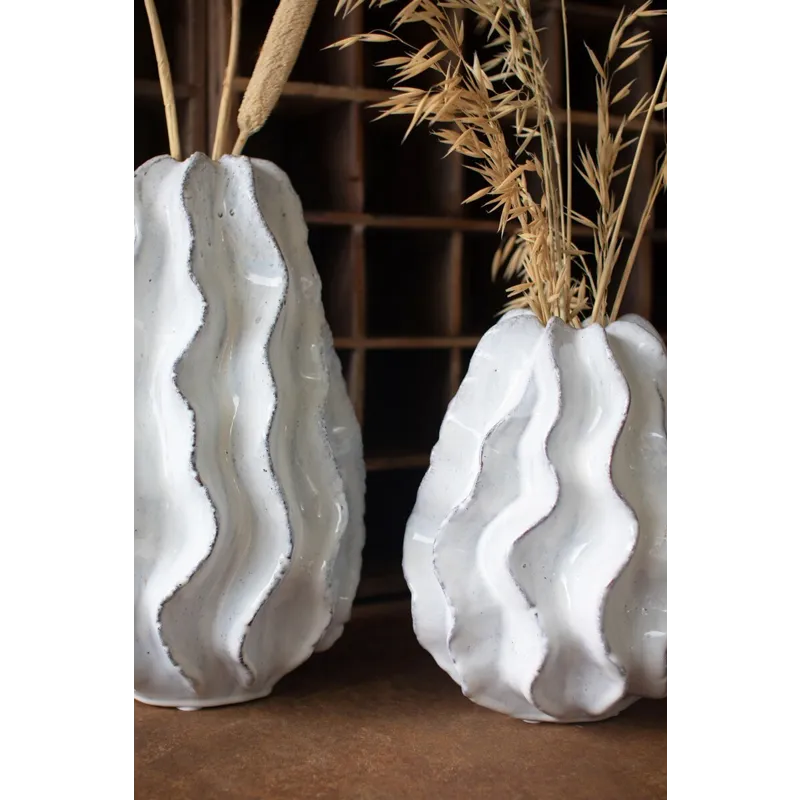 This small white ceramic ruffled vase is a sophisticated way to add style to any room.