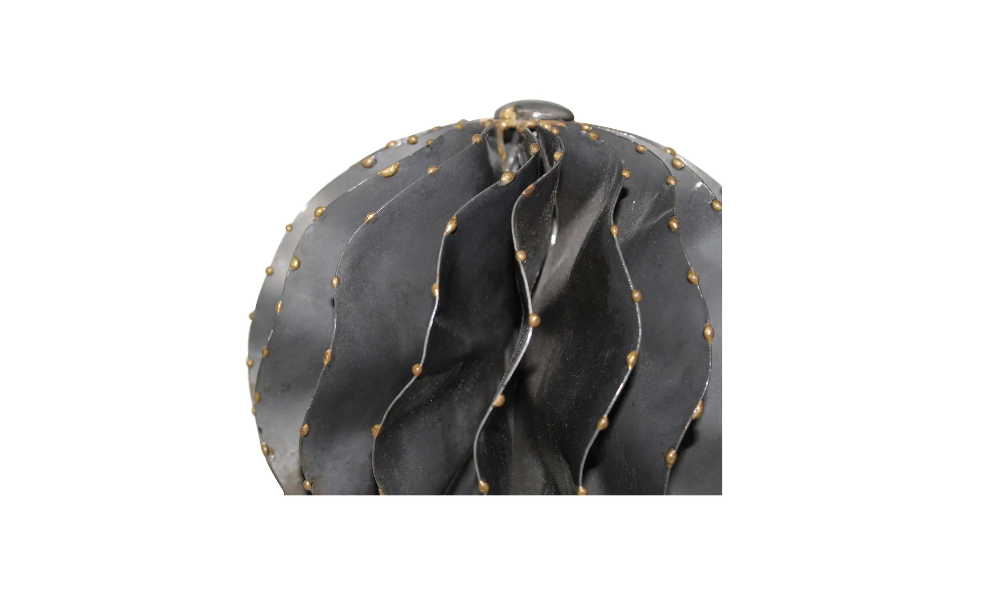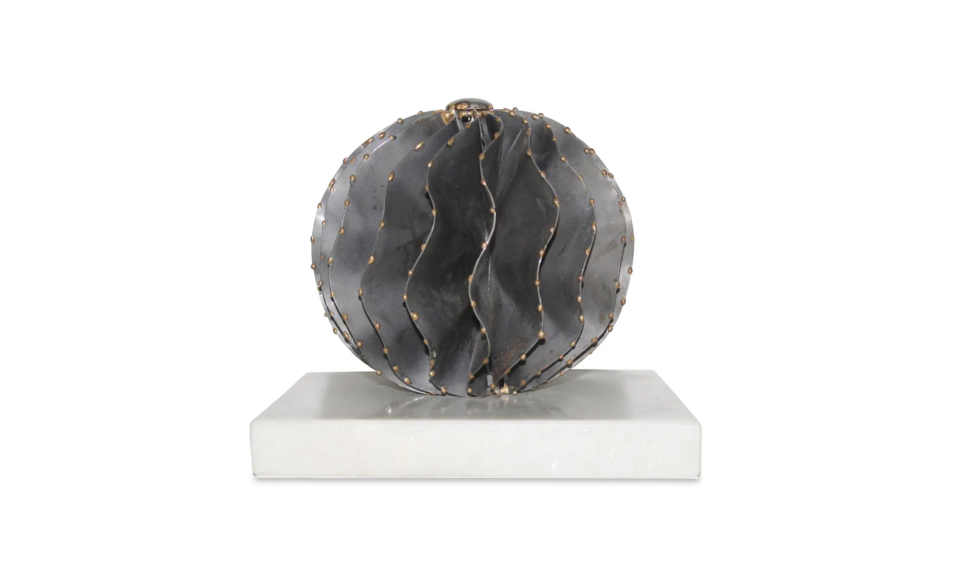This sculpted iron orb, resting on a plinth of white marble, makes the perfect accent piece for the contemporary home.