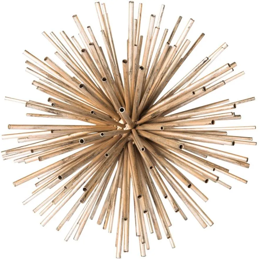 Add a three-dimensional aspect to your Décor with this contemporary, table-top art. Made of 100% iron and given a rich, gold finish, this piece resembles a miniature starburst—Stellar Home Décor.