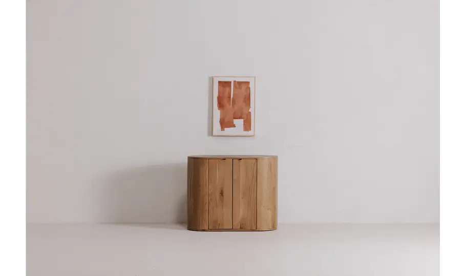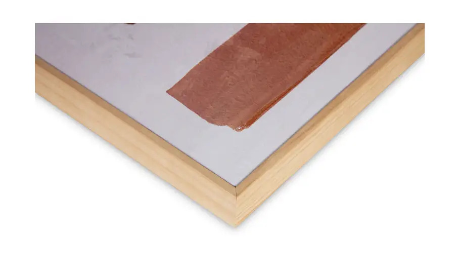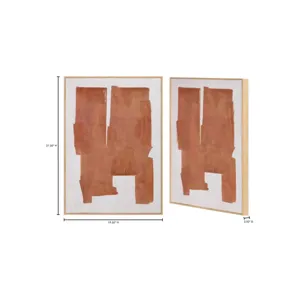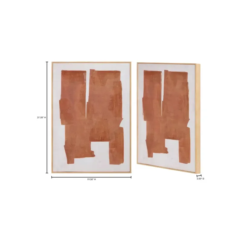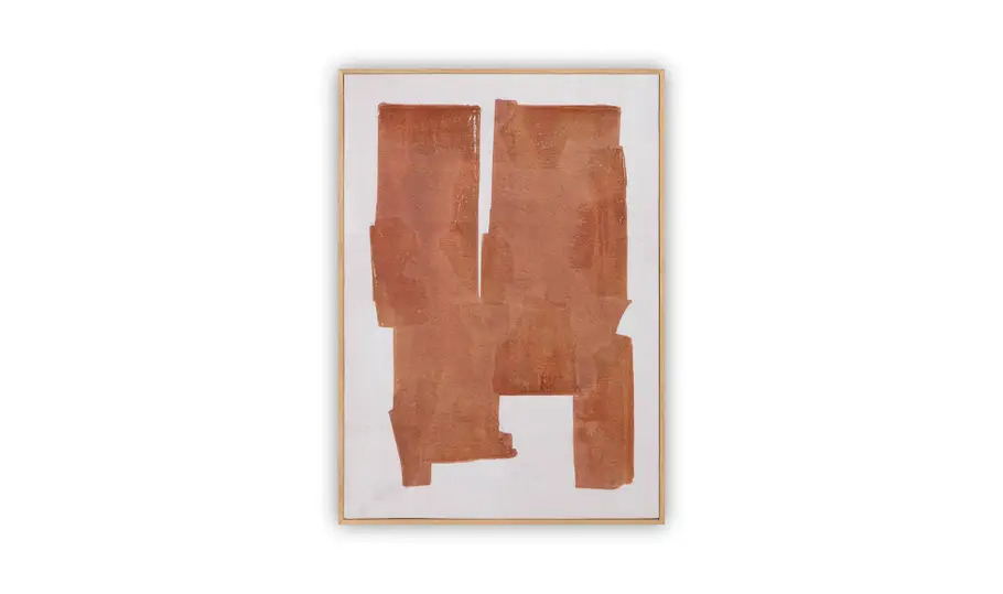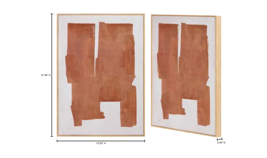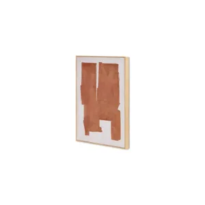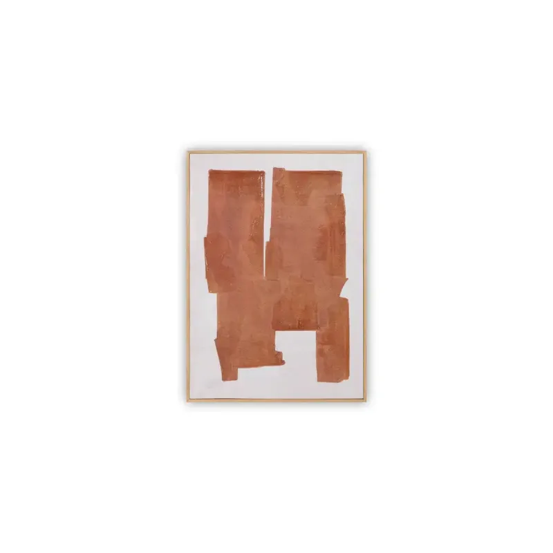 A painting with an abundance of abstract allure where sharp angles are elegantly softened by muted tones, Cici's complementing pink and orange hues evoke an earthy warmth, creating a serene yet striking composition—a captivating piece expertly finished with a solid pine frame.