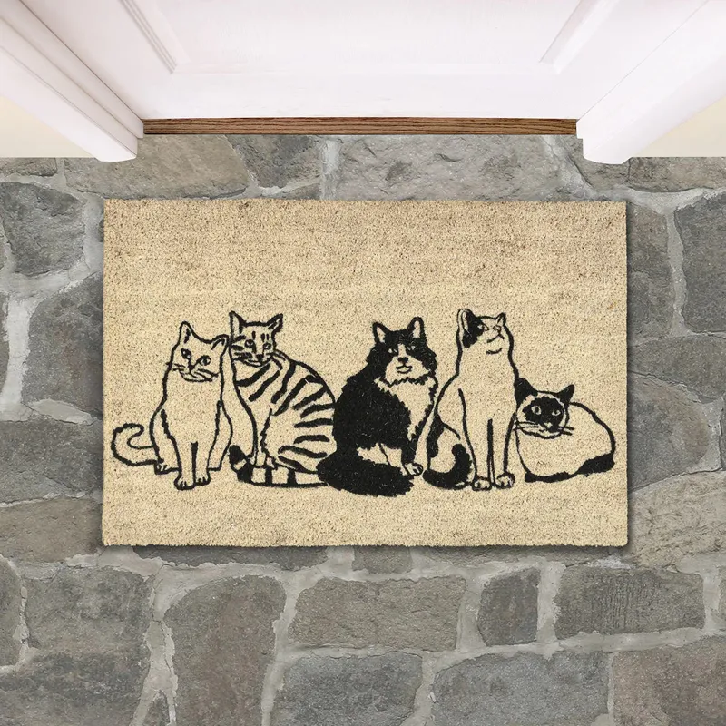 Screen printed by hand with a crew of cats, this sand-colored rug offers a casual, welcoming charm and lasting durability that enhances any high-traffic area. Coir lends a bristly texture while also making this an eco-friendly, sustainable choice.