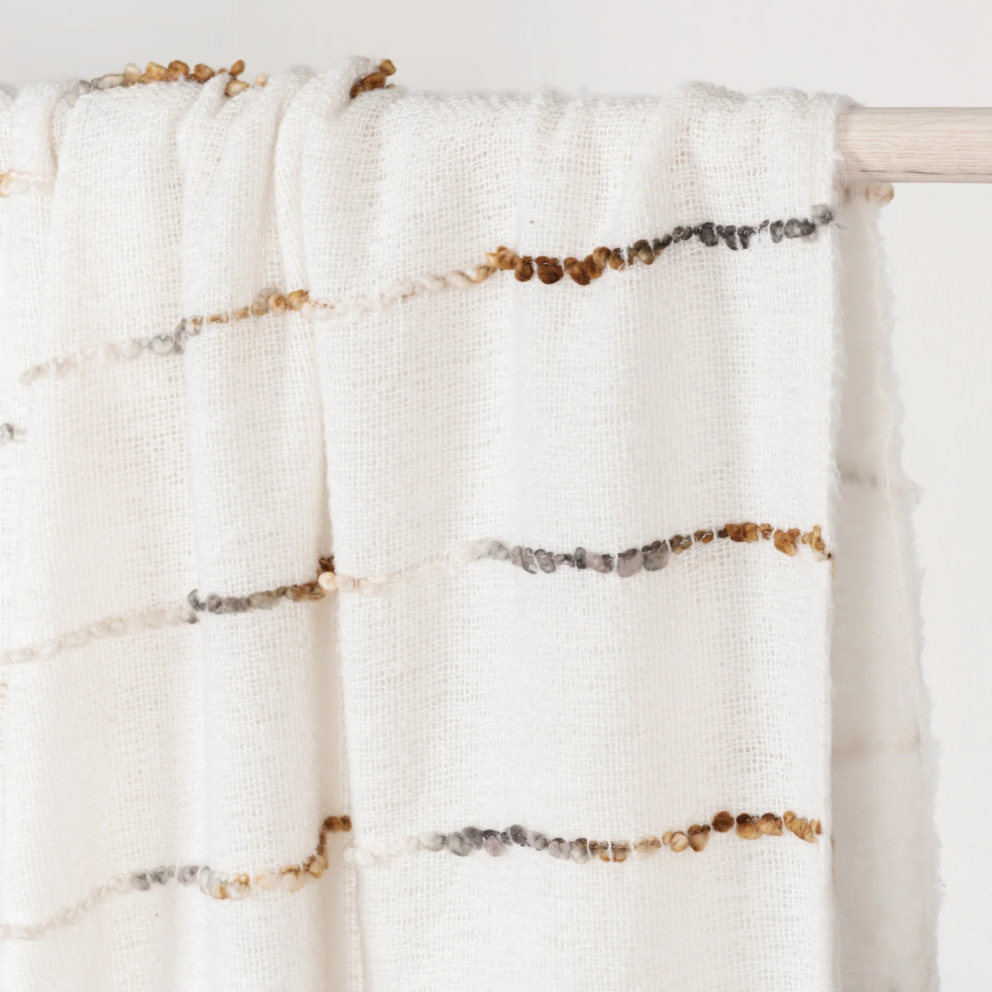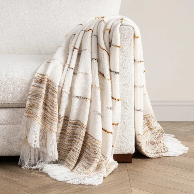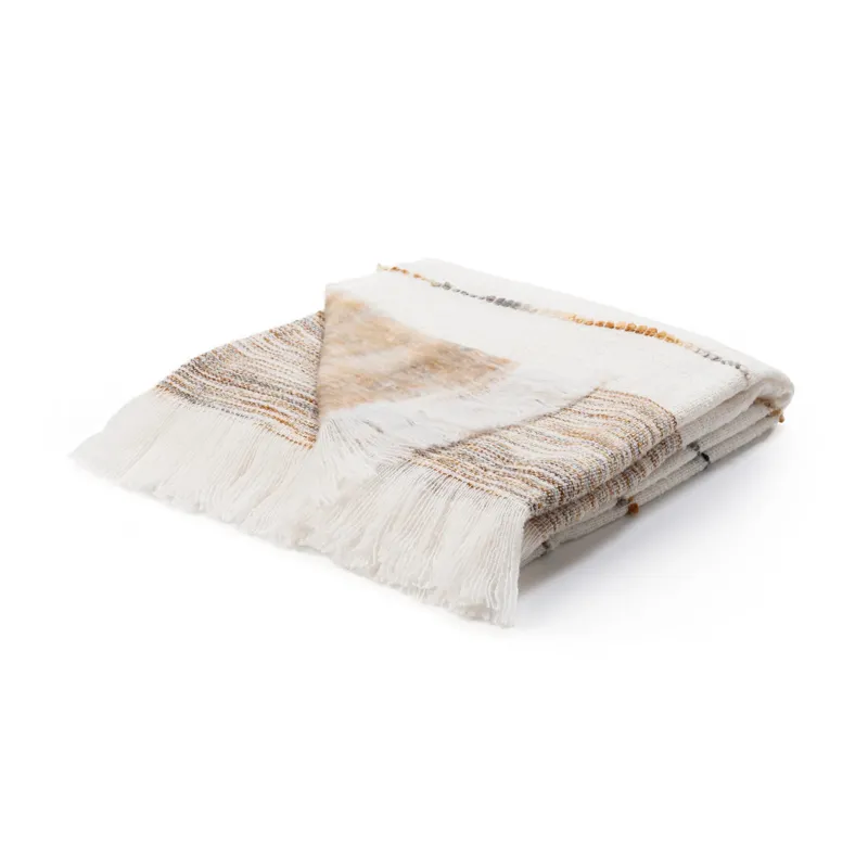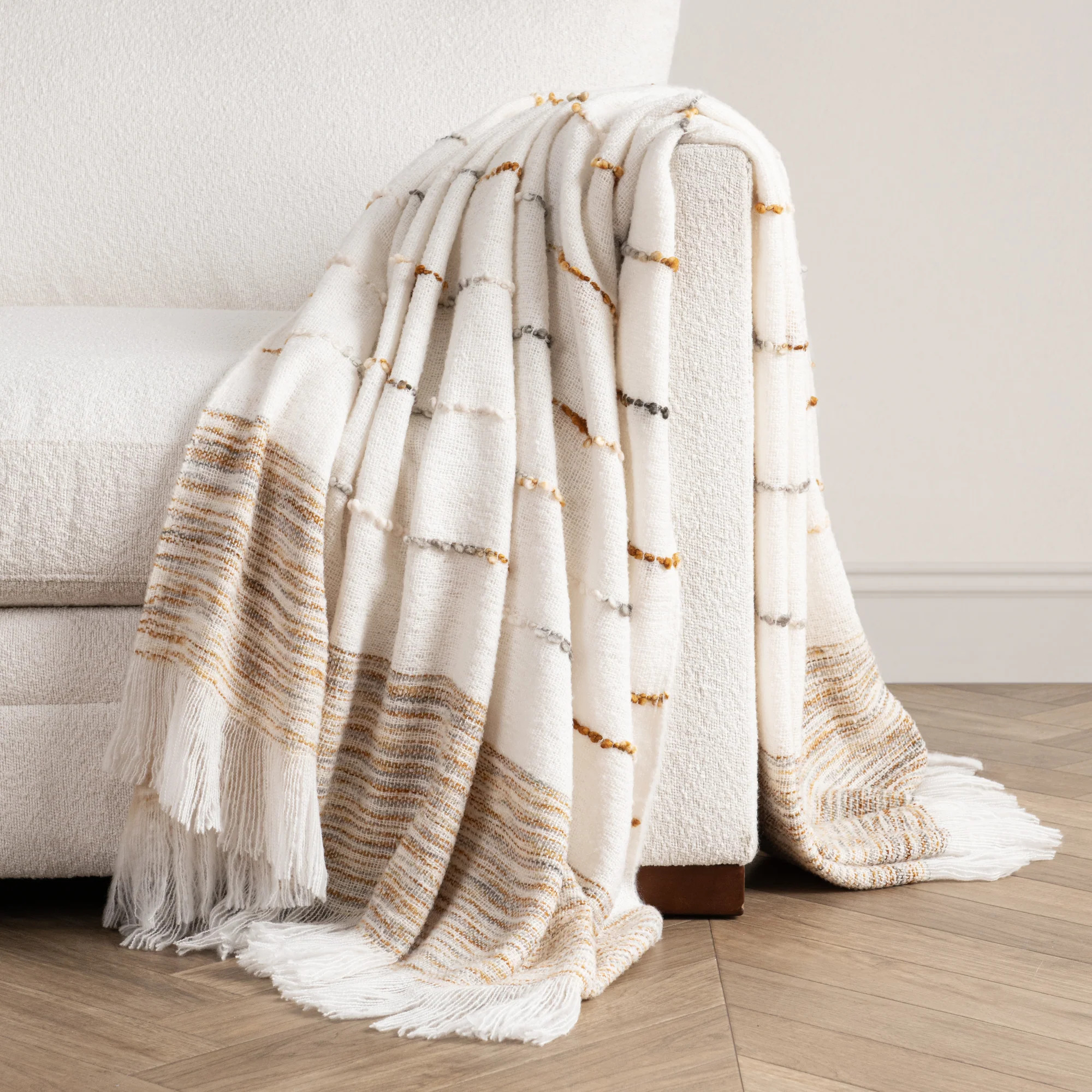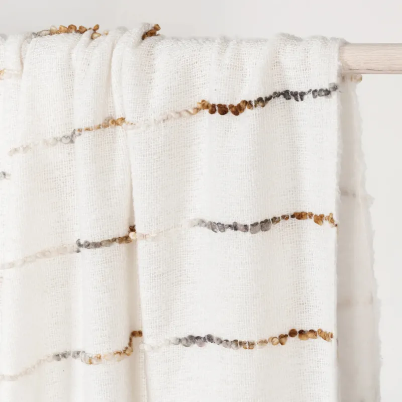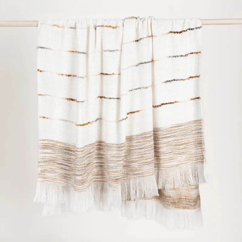 Artisanal and appealing, this throw bridges any style with its handwoven striped design, hand-knotted fringe, and subtle and soft texture. The cozyand timeless look make this throw an ideal addition to any space.