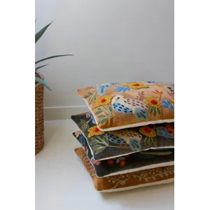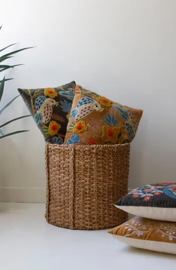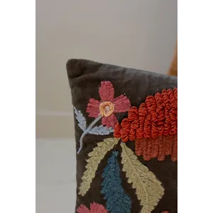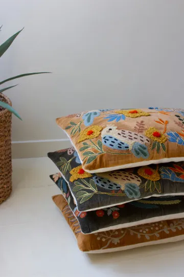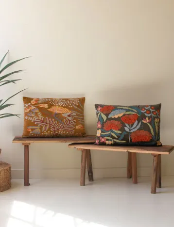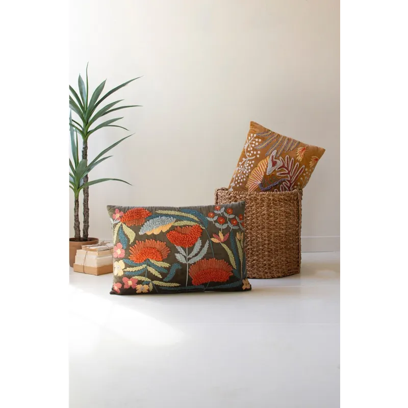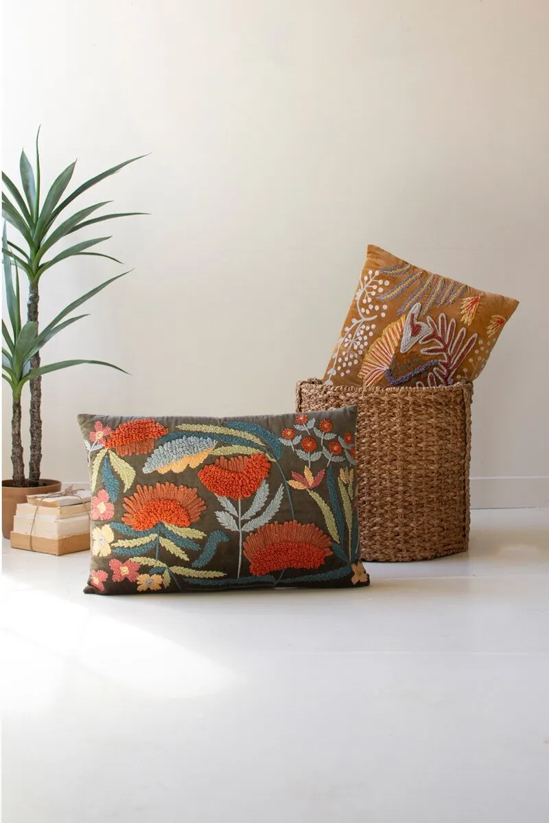 Snuggle up to this set of two embroidered pillows with flowers. The set includes one of each color and is made in India. Mix and match or split the set.