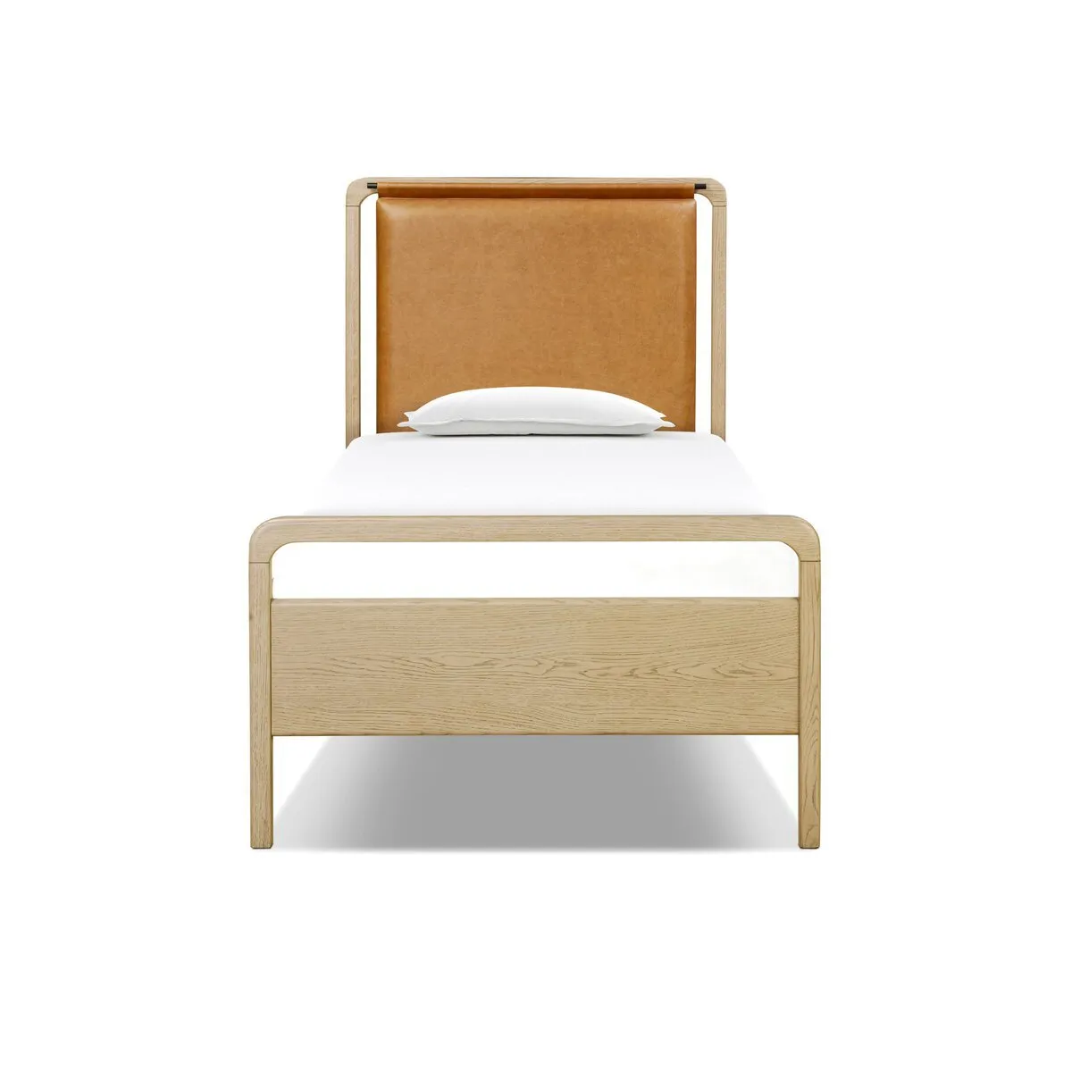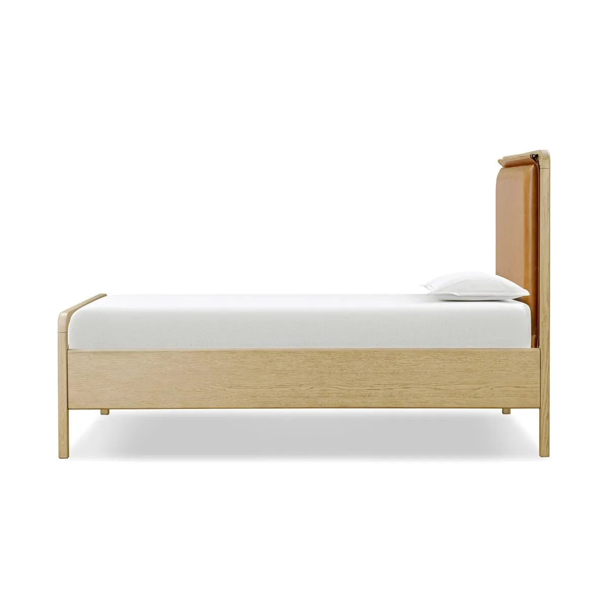Light-washed oak frames a floating, sling-style headboard made from tan top-grain leather, with subtly rounded edges and metal dowel detailing. Rounded edges bring a touch of softness to the bedroom.