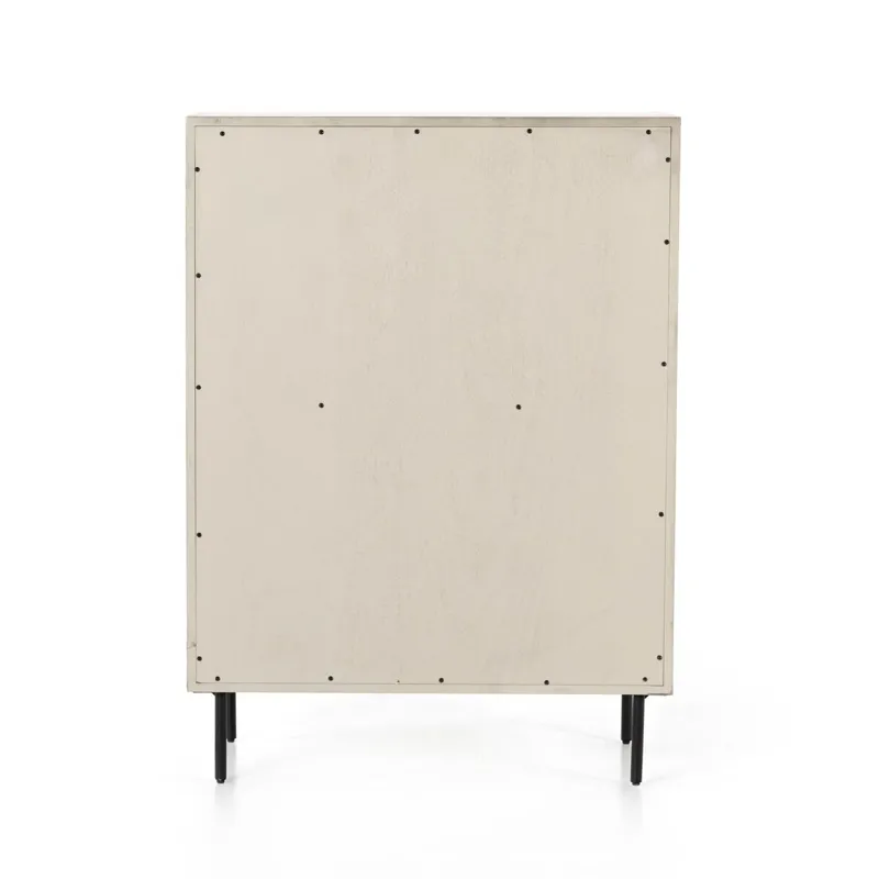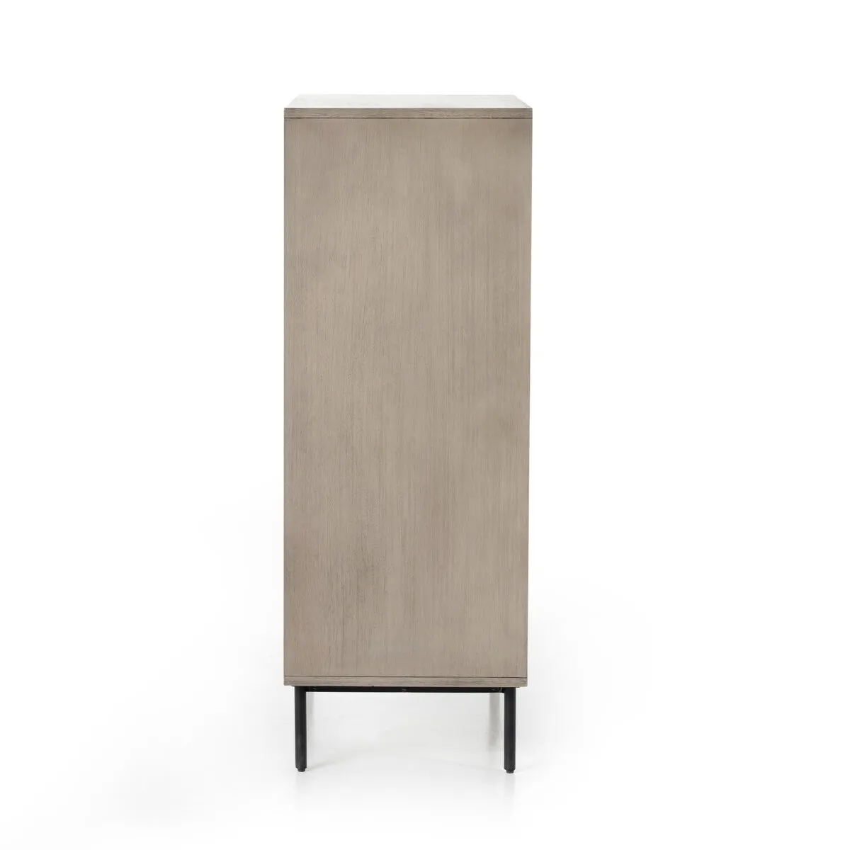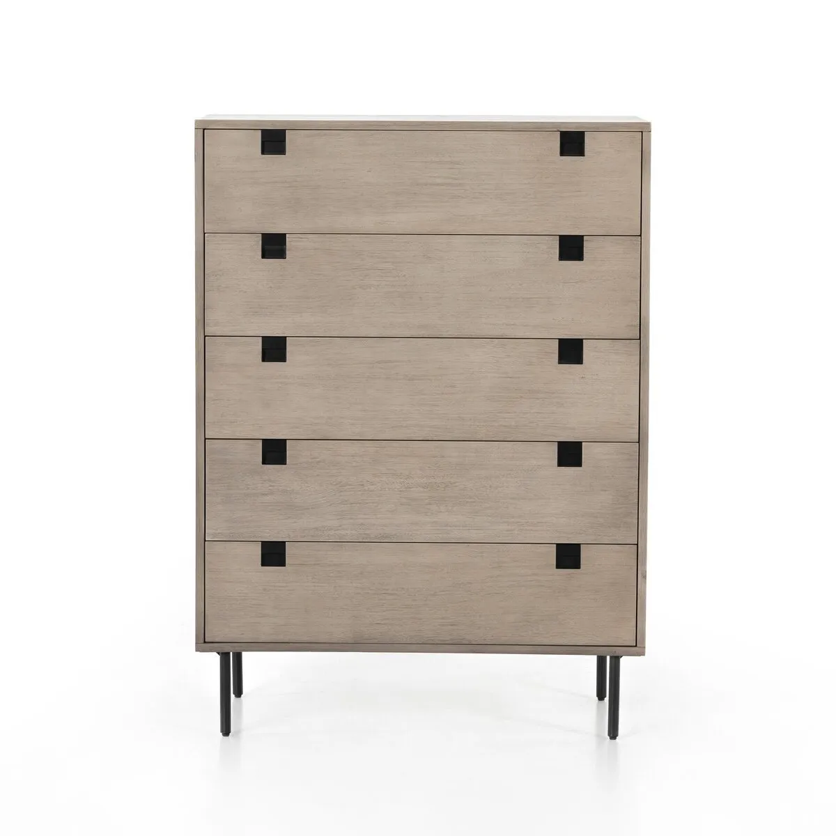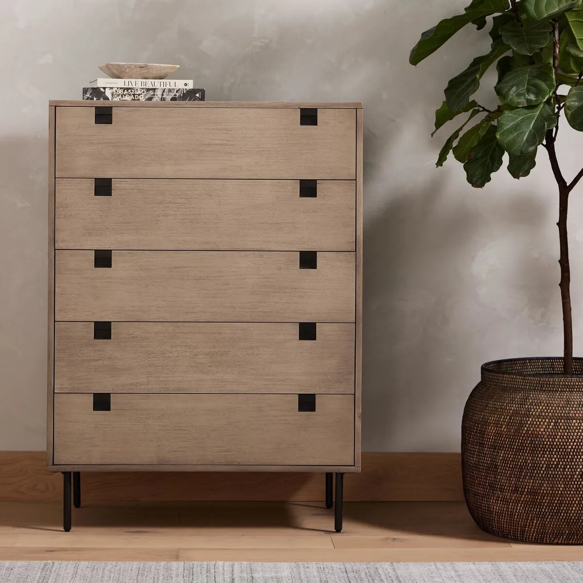 Clean, streamlined shaping brings a structured-yet-light look to bedroom storage, with five spacious drawers of grey-washed acacia veneer perched atop iron legs finished in an antique bronze. This item has been modified to comply with the STURDY Act. See a full list of modified products and data changes in the “STURDY Act” file in the Downloads section below.