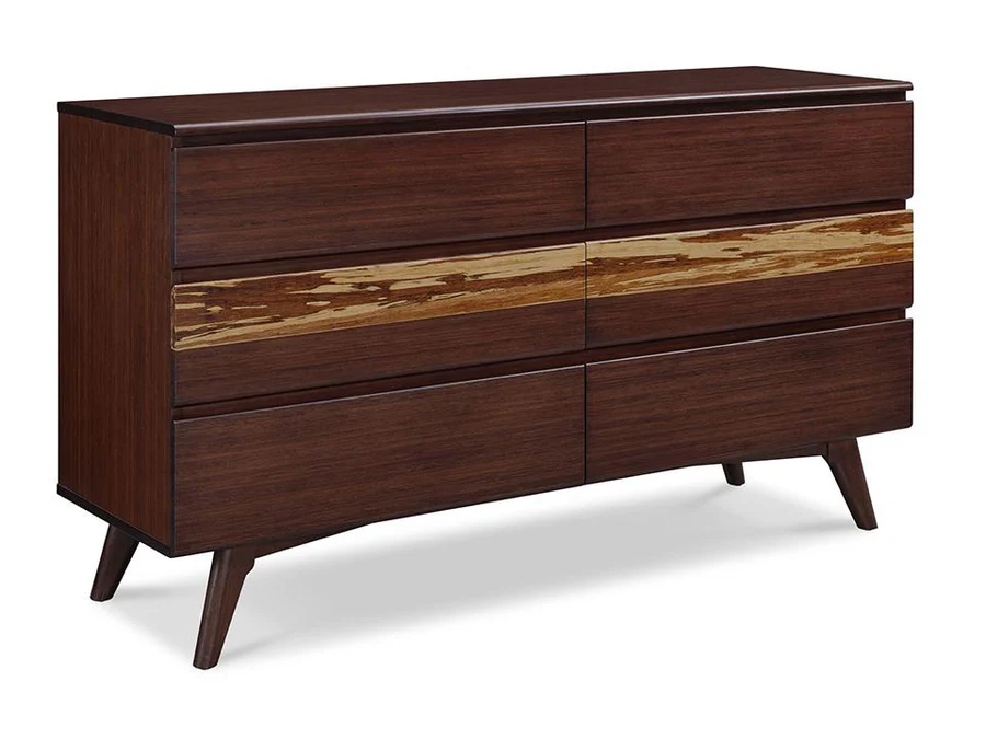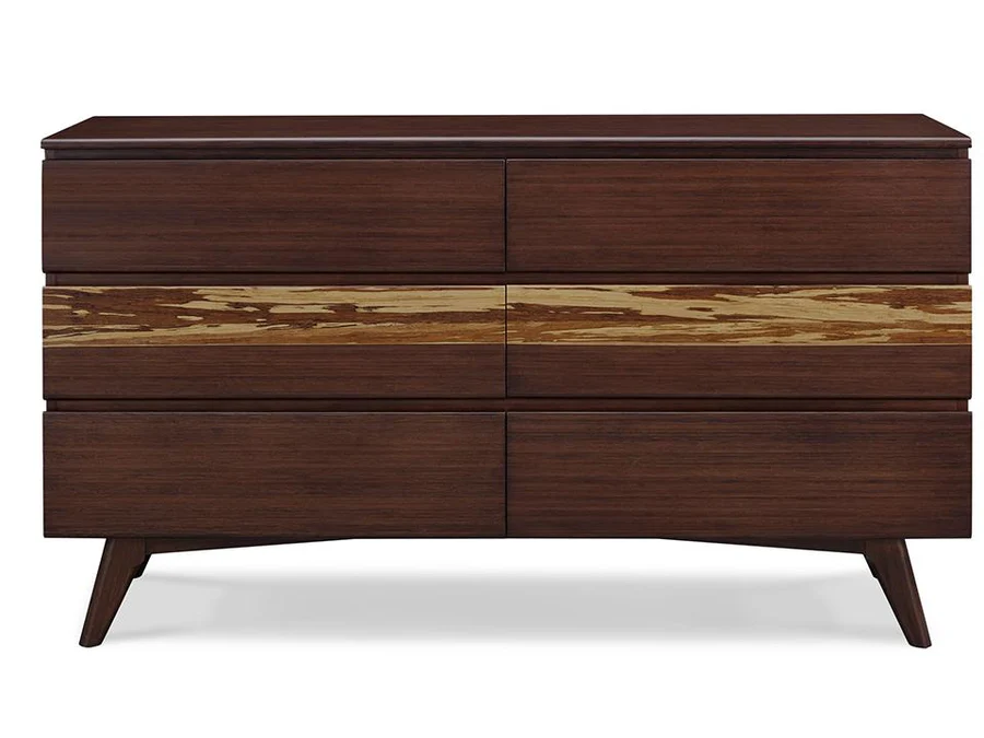 Wrapped in flawless craftsmanship with all-around finishing, the Azara six drawer dresser continues the narrative of quiet luxury, soft-close under-mount glides, with two drawer faces accented in dramatic Exotic Tiger bamboo. Inside, solid bamboo drawer boxes constructed using English dovetail joinery, reflect the collection’s uncompromising attention to detail.
