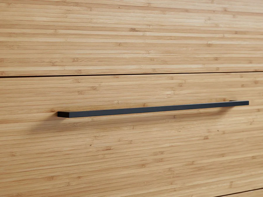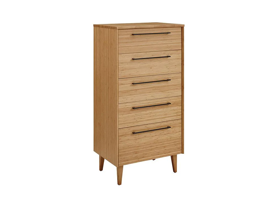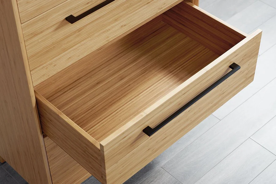 The Sienna chest features five storage drawers built in solid bamboo, finished inside and out, and constructed using English dovetail joinery with soft closing, under mount drawer glides. Finishing the upscale look are matte black stainless-steel drawer pulls.