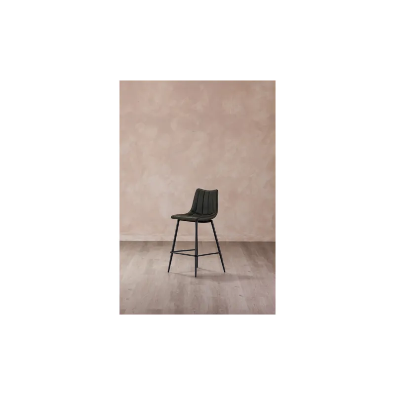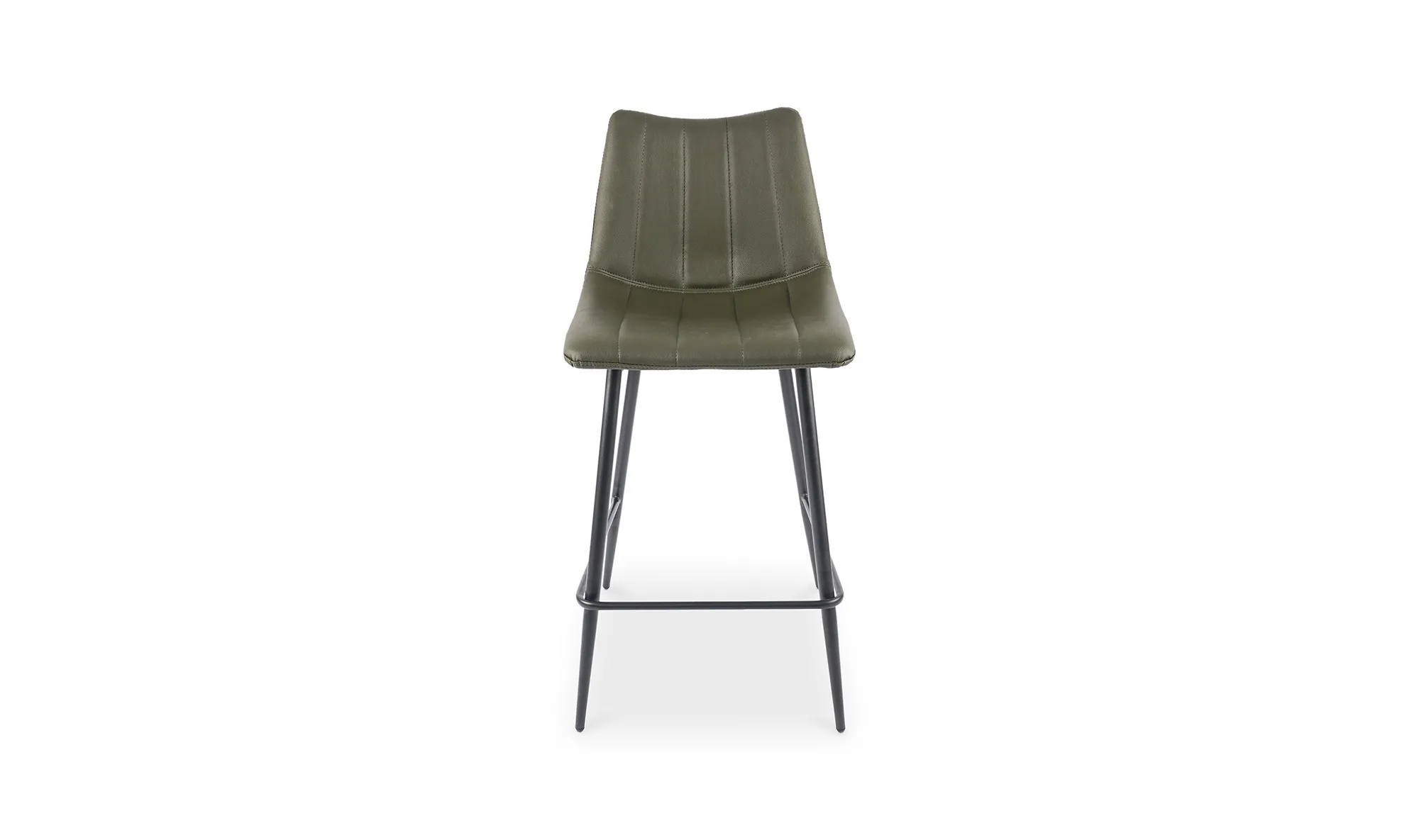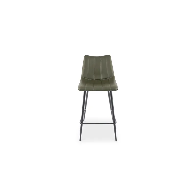 Contemporary modern counter stools get a new take with this sleek aesthetic. Available in several colors, the Alibi counter stool features striking vertical line stitches that add subtle detail to its monochromatic design. A soft vegan leather seat is shaped to fit for comfort so guests can relax at the island or bar counter.