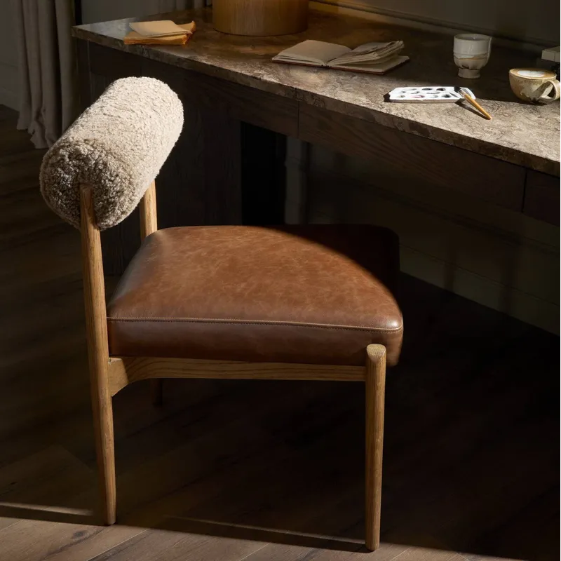 The armless dining chair gets a playful update with mixed materials and a bolstered cylinder seat back. Made from solid oak, top-grain leather and soft shearling — a Seventies-inspired material mix to elevate any dining space.