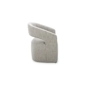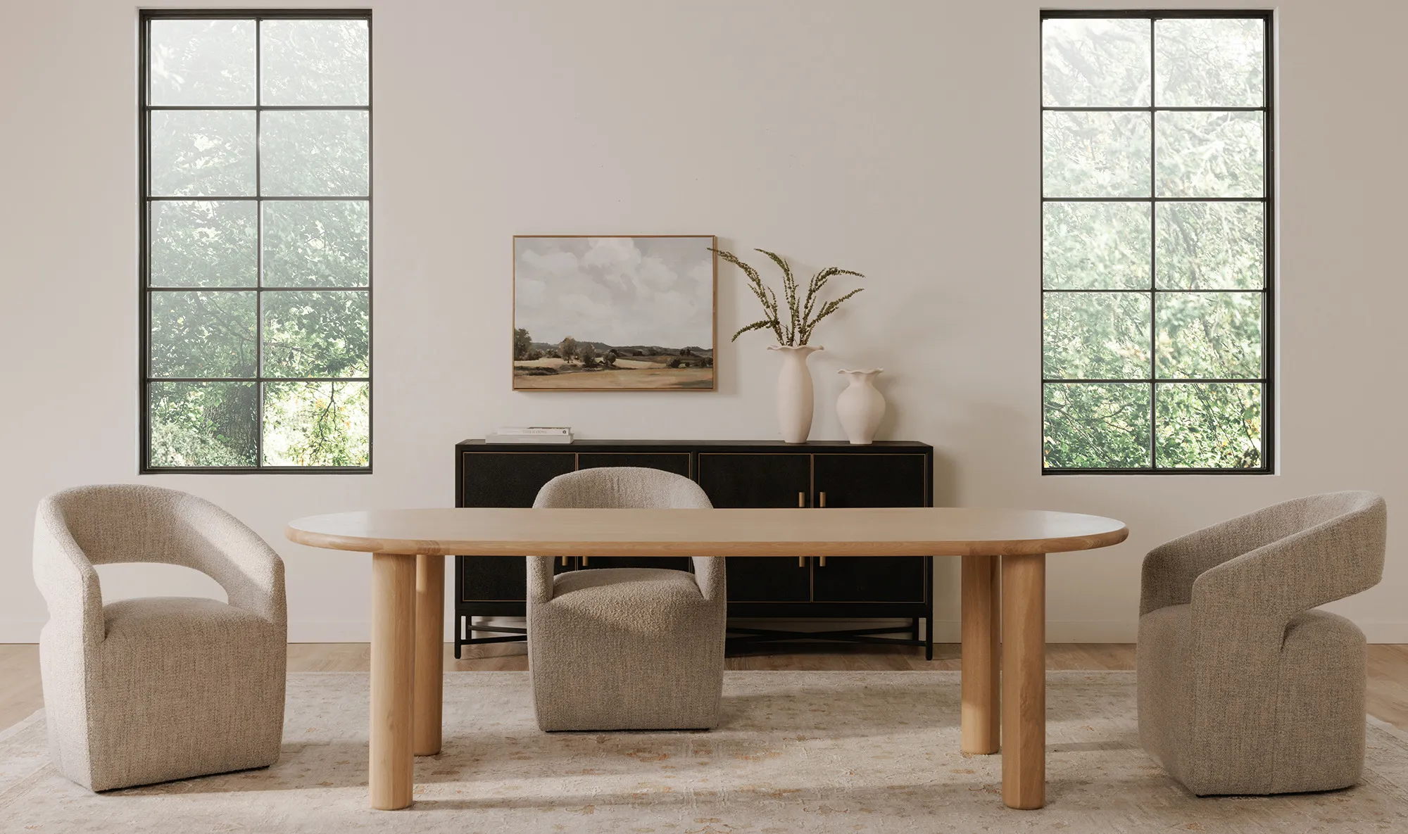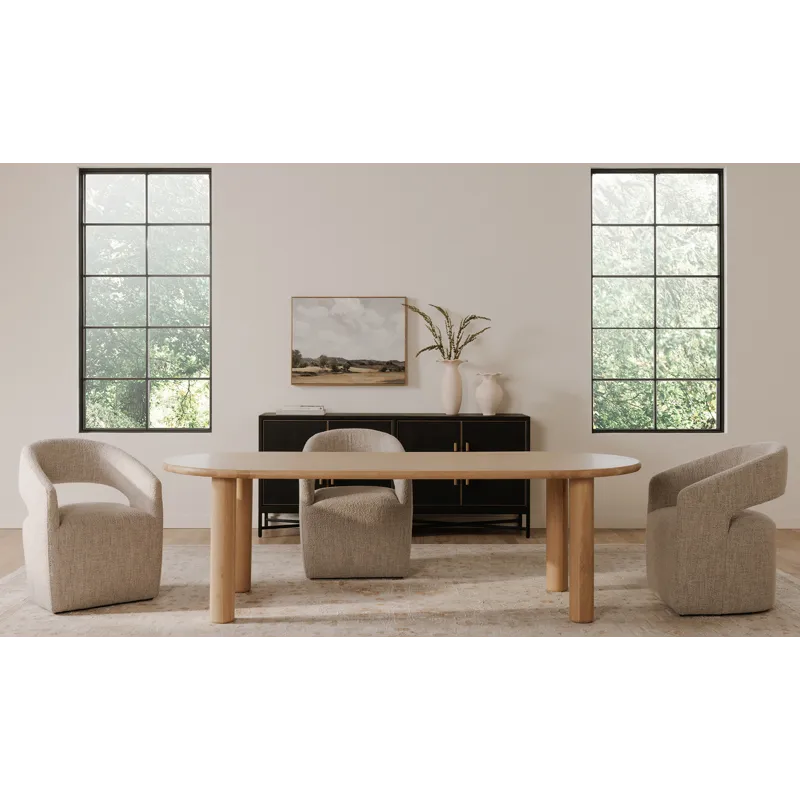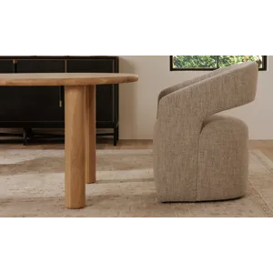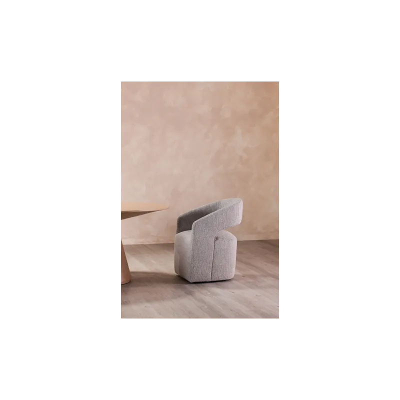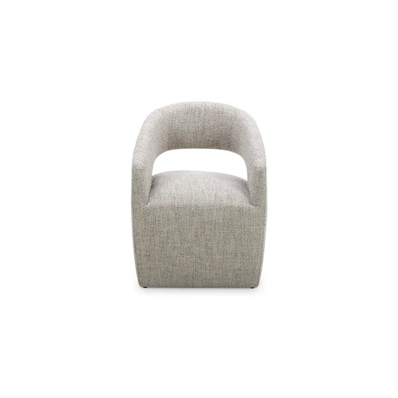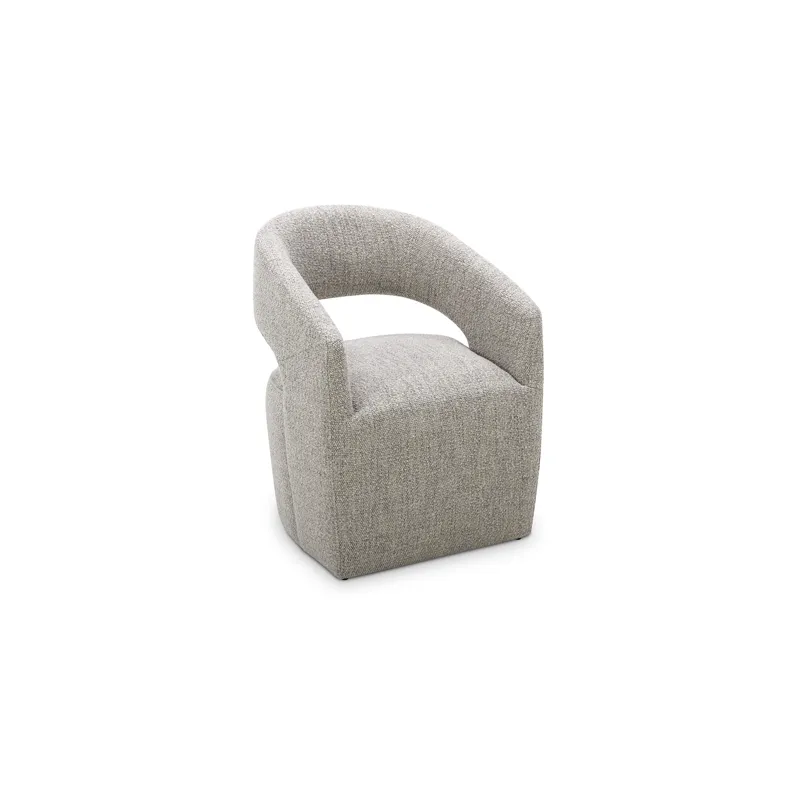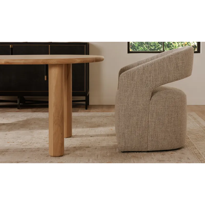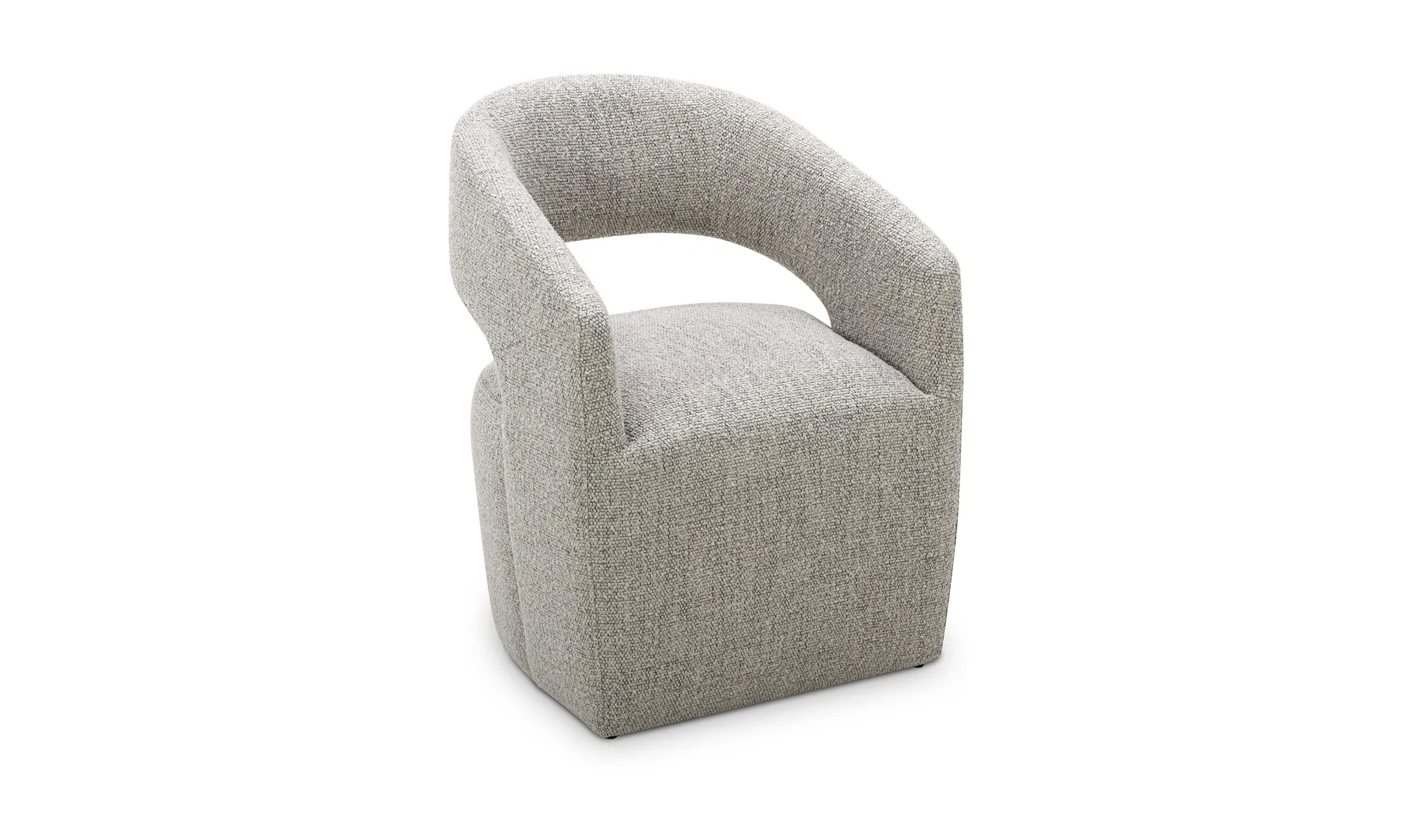 A contemporary dining chair upholstered with a NeverFear performance boucle, Barrow is easy to clean and easy on the eyes with a rolling base that lets you pass the peas and bounce from conversation to conversation. The curved back, along with the ultra-comfortable feather, high-density foam and poly-fill cushioned seat adds living room comfort to the dining experience.
