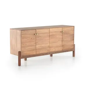 The subtle glamour of aged brass covers this clean-lined sideboard. Mitered doors and industrial spit-tack detailing. Inside features natural grey finished mango wood shelves for storage.