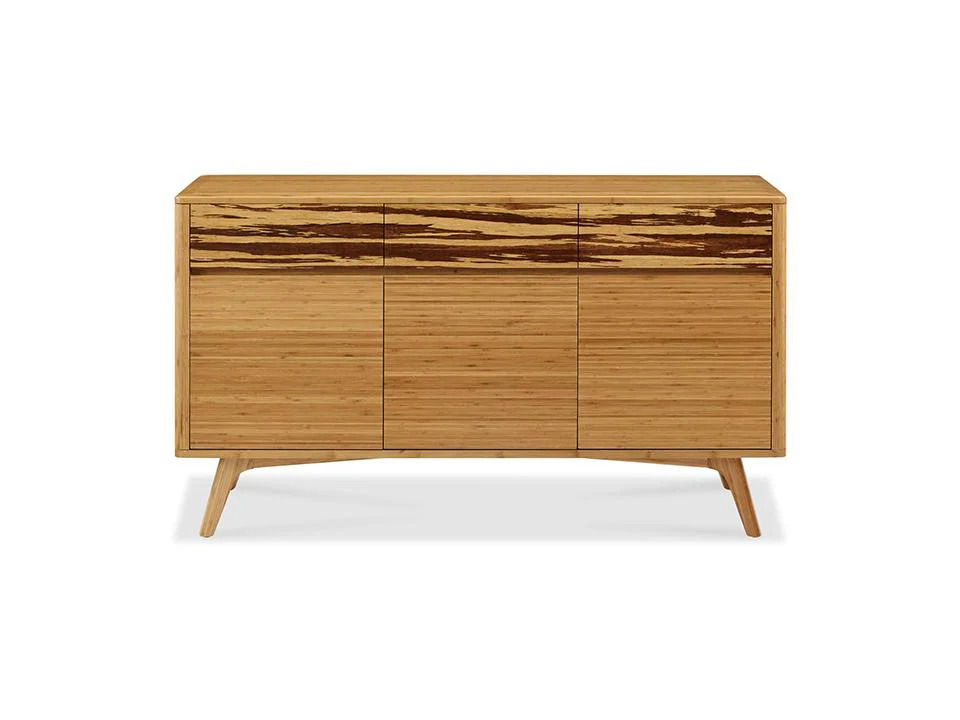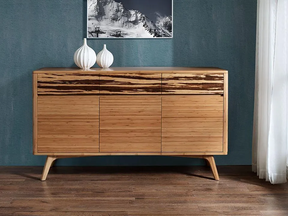 Elevate your dining experience with the Azara sideboard—where bold design meets refined craftsmanship. Expertly crafted in earth-friendly solid bamboo, the sideboard’s natural Caramelized finish is dramatically accented with three drawer faces in solid Exotic Tiger bamboo, showcasing nature’s artistry in every grain. Beautifully finished on all four sides, the sleek, sculpted silhouette is anchored by architecturally inspired legs—angled and tapered for both strength and modern flair.