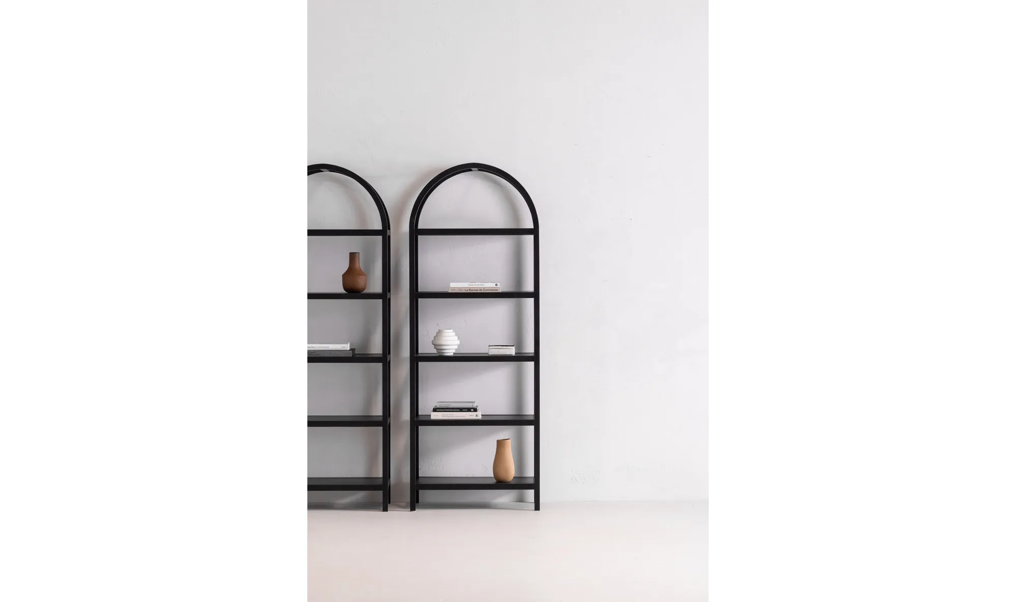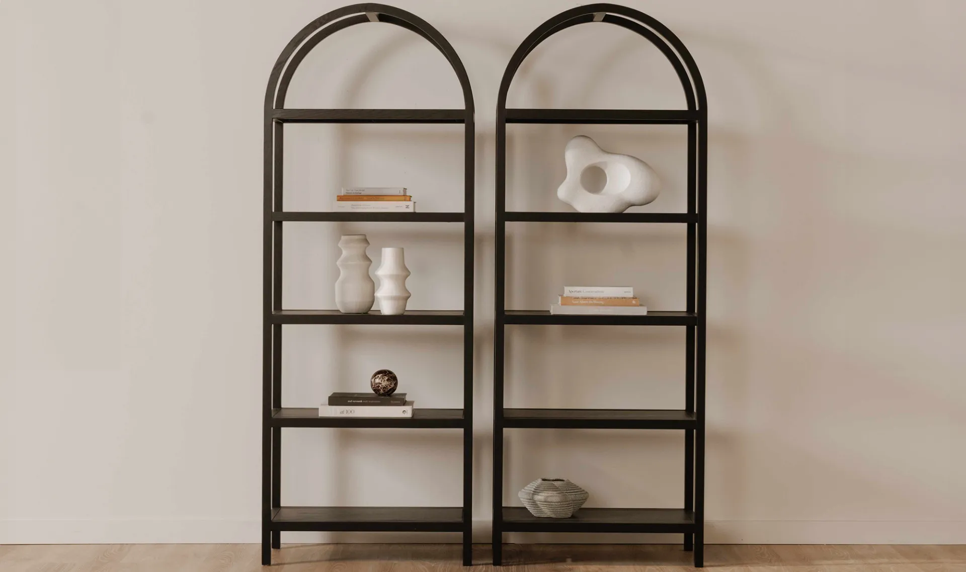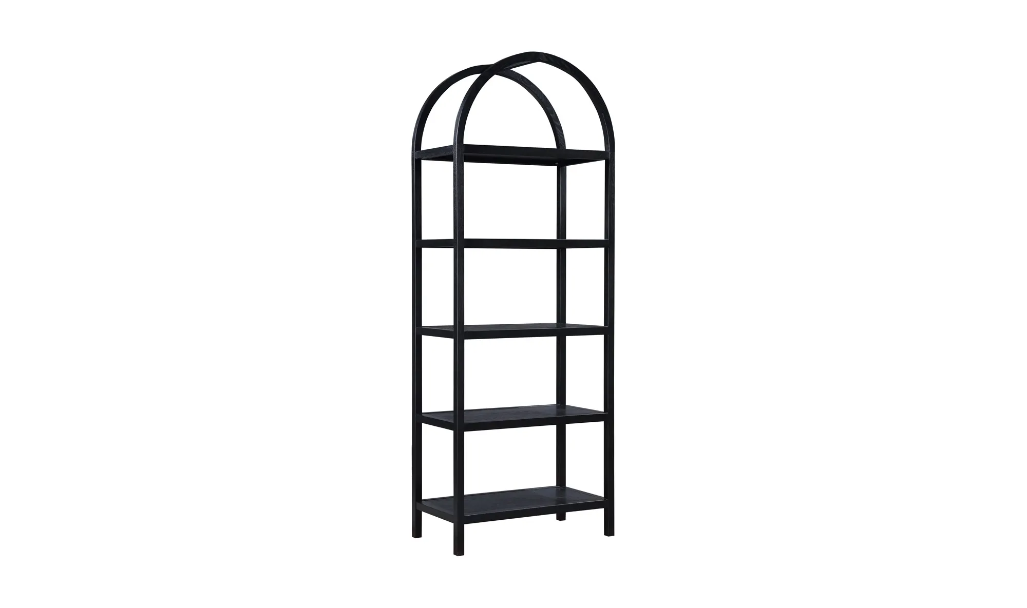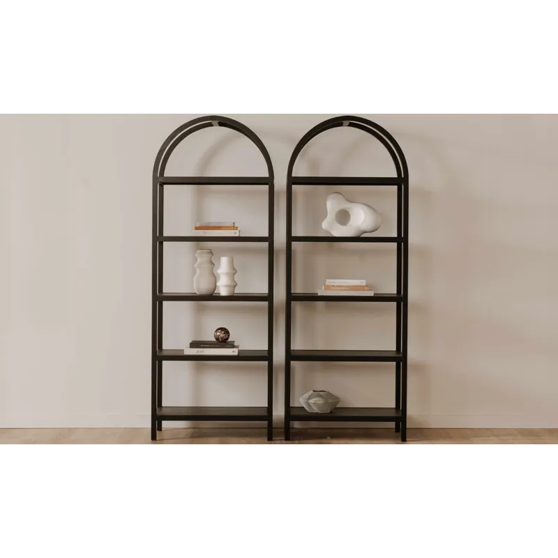 An artistic blend of style and sturdiness, the Eero bookcase features a solid oak frame with oak-veneered shelves ready to display cherished books, keepsakes, and collectibles. Its dark finish engenders moody sophistication, while the arch support is a testament to exquisite architectural design.