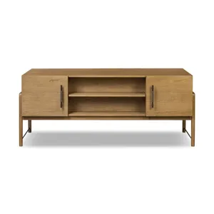 Amber-finished oak crafts shapes a clean silhouette, accented with iron hardware wrapped in black top-grain leather. Vary-sized drawers offer plenty of storage, while outset legs bring a design-forward touch.