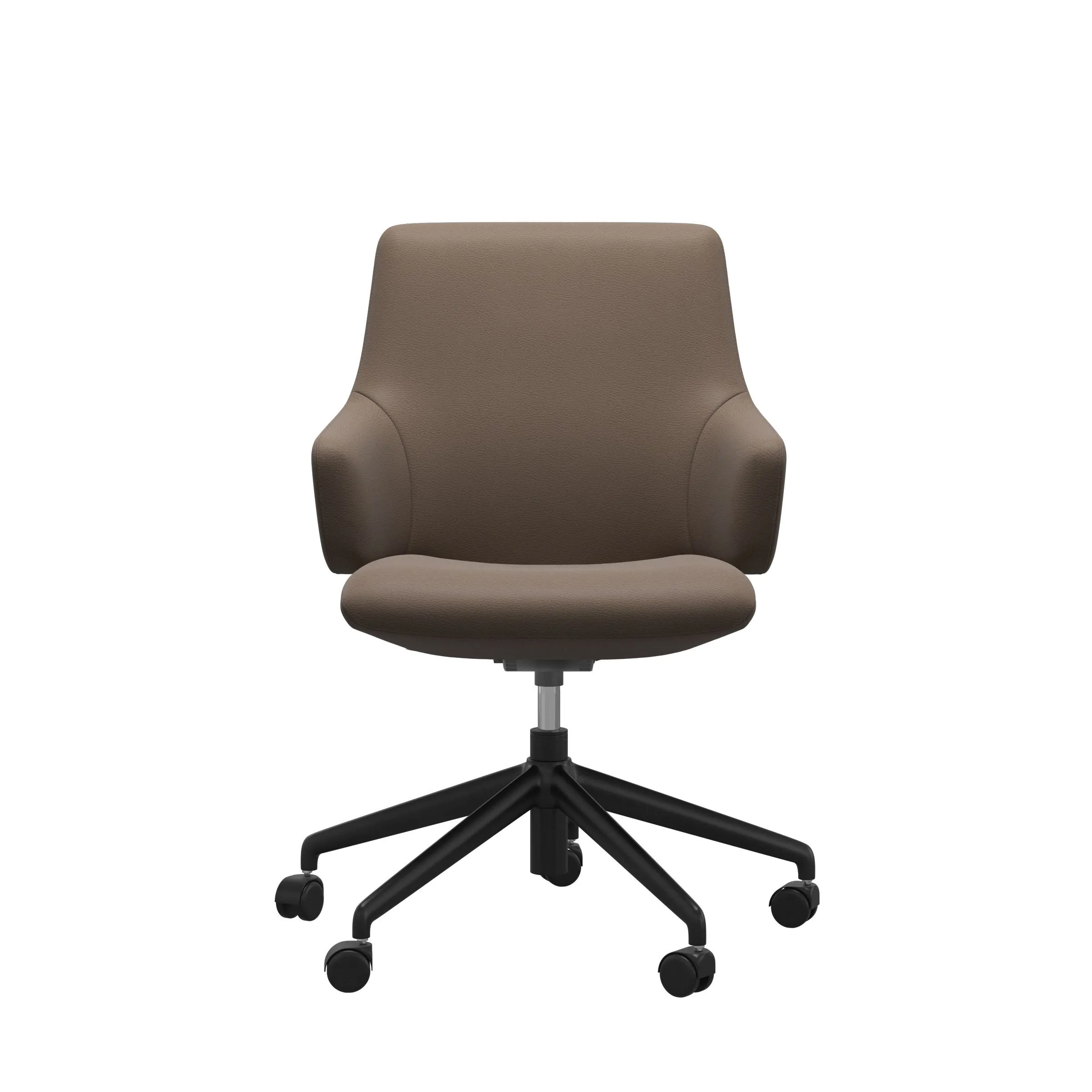 Stressless® Home Office chairs are designed to blend in with any style. The chairs let you effortlessly shift positions throughout the day. The seat and back will follow your movements and offer good support. Lean back and the backrest will recline while the seat moves forward in a coordinated movement. A discrete flexibility in the seat offers good support and reduces the pressure on your lower thighs as you lean forward. The wide range of covers makes it easy to match with the rest of the interior (you can even get Dining Chairs with the exact same cushion design and cover choices). The wheels on the base make it easy to move around and there is also a lever under the seat that allows you to adjust the seat height by up to 4 inches.
