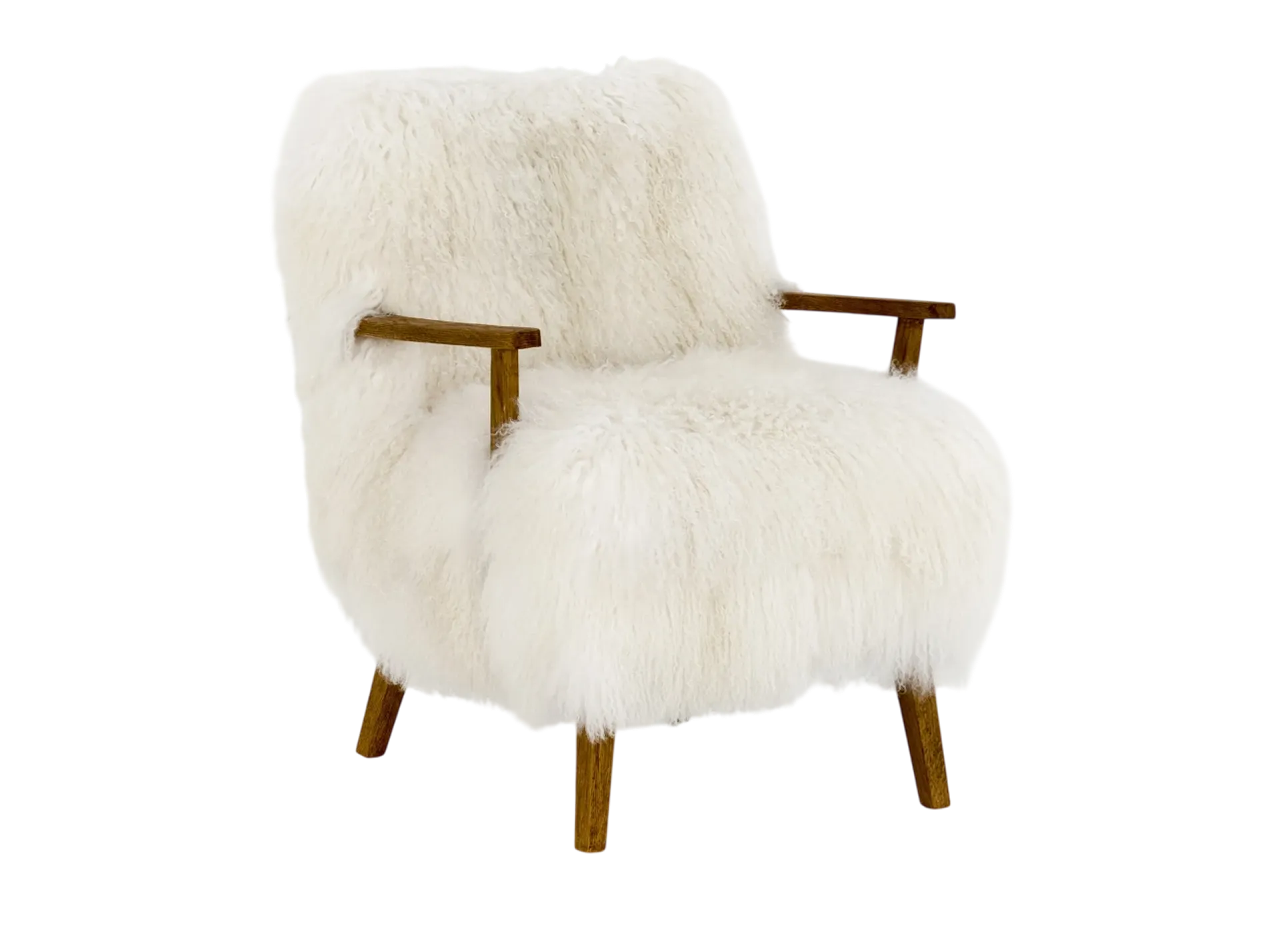 The modern statement-maker. Sculpted arms of drifted oak emerge from shaggy, cream-colored seating of Mongolian fur.