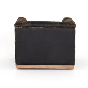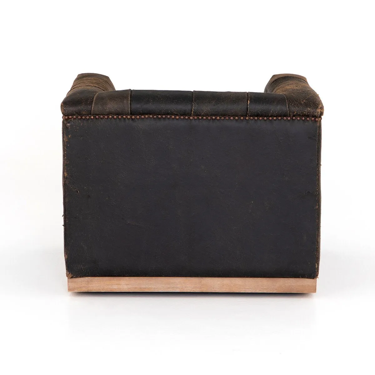 A modern take on the classic library chair. Covered in black top-grain leather and finished with a specially designed formula that creates intentional cracking and distressing for a naturally aged look. Mounted on a 360-degree swivel base of weathered oak and finished with aged bronze nailheads.