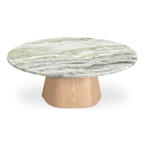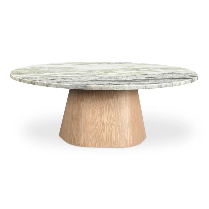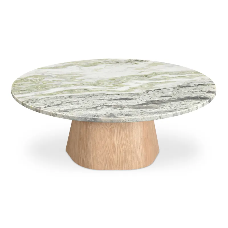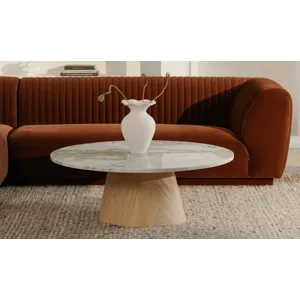 The Evelyn coffee table is a harmonious contrast of materiality and tactility, where a weighty base meets a visually light marble top. With five connected sides equipped with softened, rounded edges, the base assumes an organic appearance, its natural color subtly softening the marble top for enduring visual appeal.