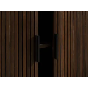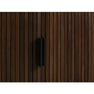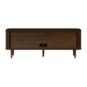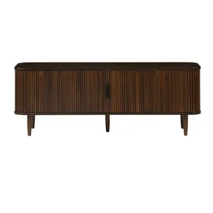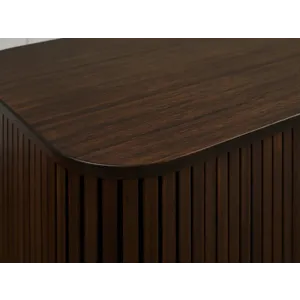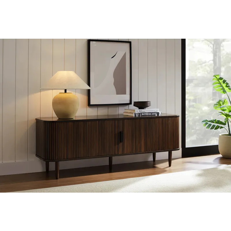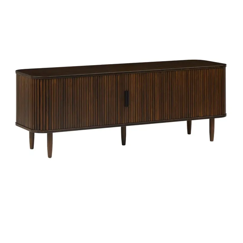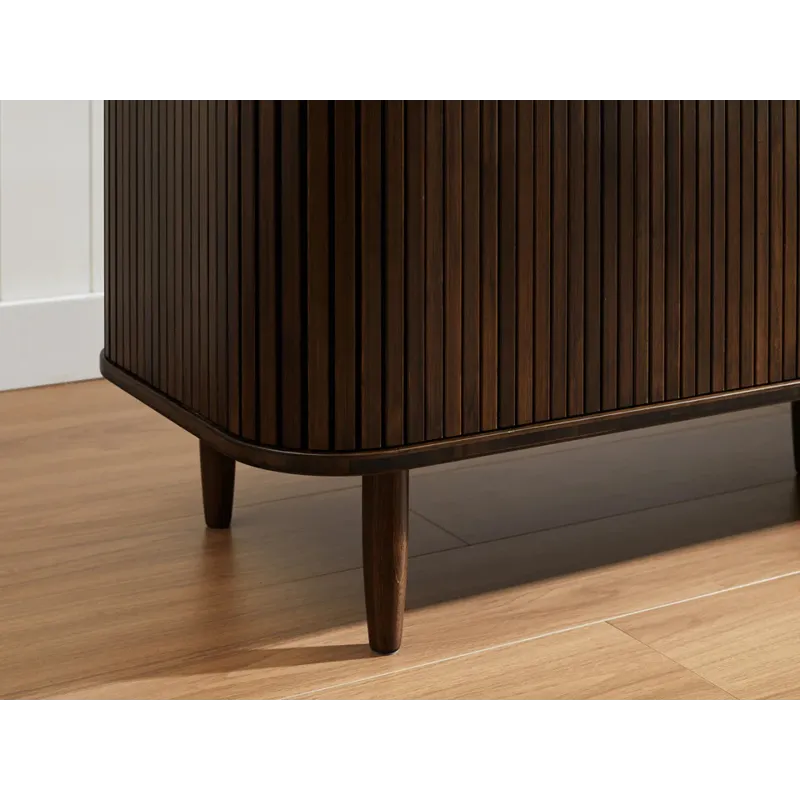 The Carmel console celebrates exquisite craftsmanship with a design that effortlessly anchors any living space. Its soft, rounded corners elegantly conceal tambour doors that glide open to reveal a spacious interior with four shelves, offering both style and practicality for storing your essentials. The sleek vertical pulls and gracefully tapered legs complete the piece, lending a timeless sophistication and refined elegance.