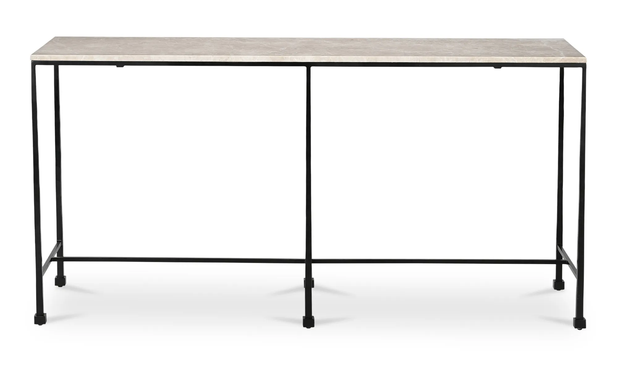 Anchored by a sleek iron base adorned with hammered details, the River console table's square base sculpture detail injects an unmistakable artistic flair that is crowned with a soft Italian Botticino marble top. The striking contrast of textures enhances visual interest that captivates and endures.