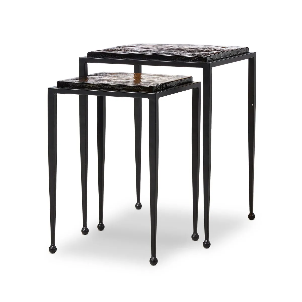 Slim, airy bases of black-finished iron support two varied-height nesting tables of smoked black glass. Designed to bunch or pull apart as desired, with ease.