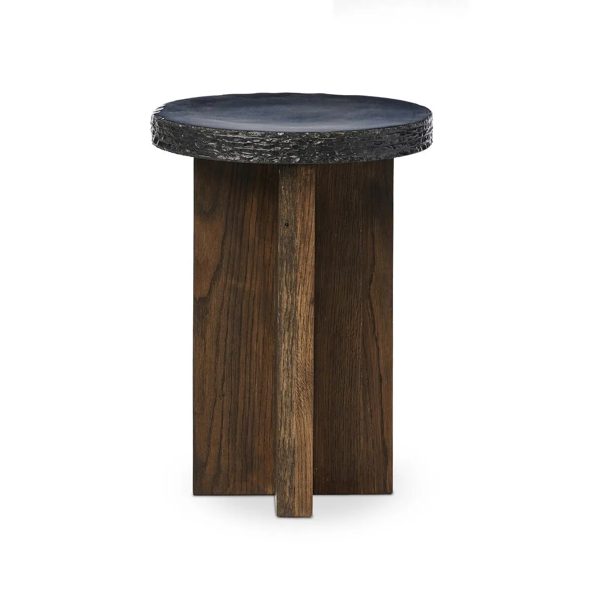 Natural elements and architectural inspiration, captured in a smaller-scale end table. Rounded basalt tabletop and intersecting oak plane makes a statement in any space.