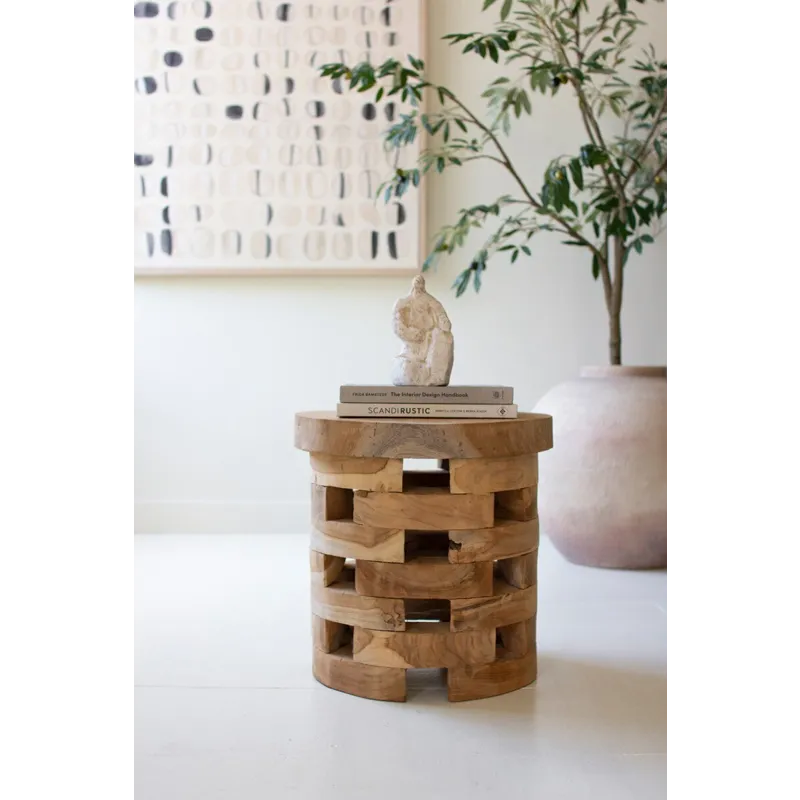 This round teakwood stool has a Puzzle design. Grab one for guest spaces or use it as an accent table in an empty corner. Top it with a vase or other decor items. Â