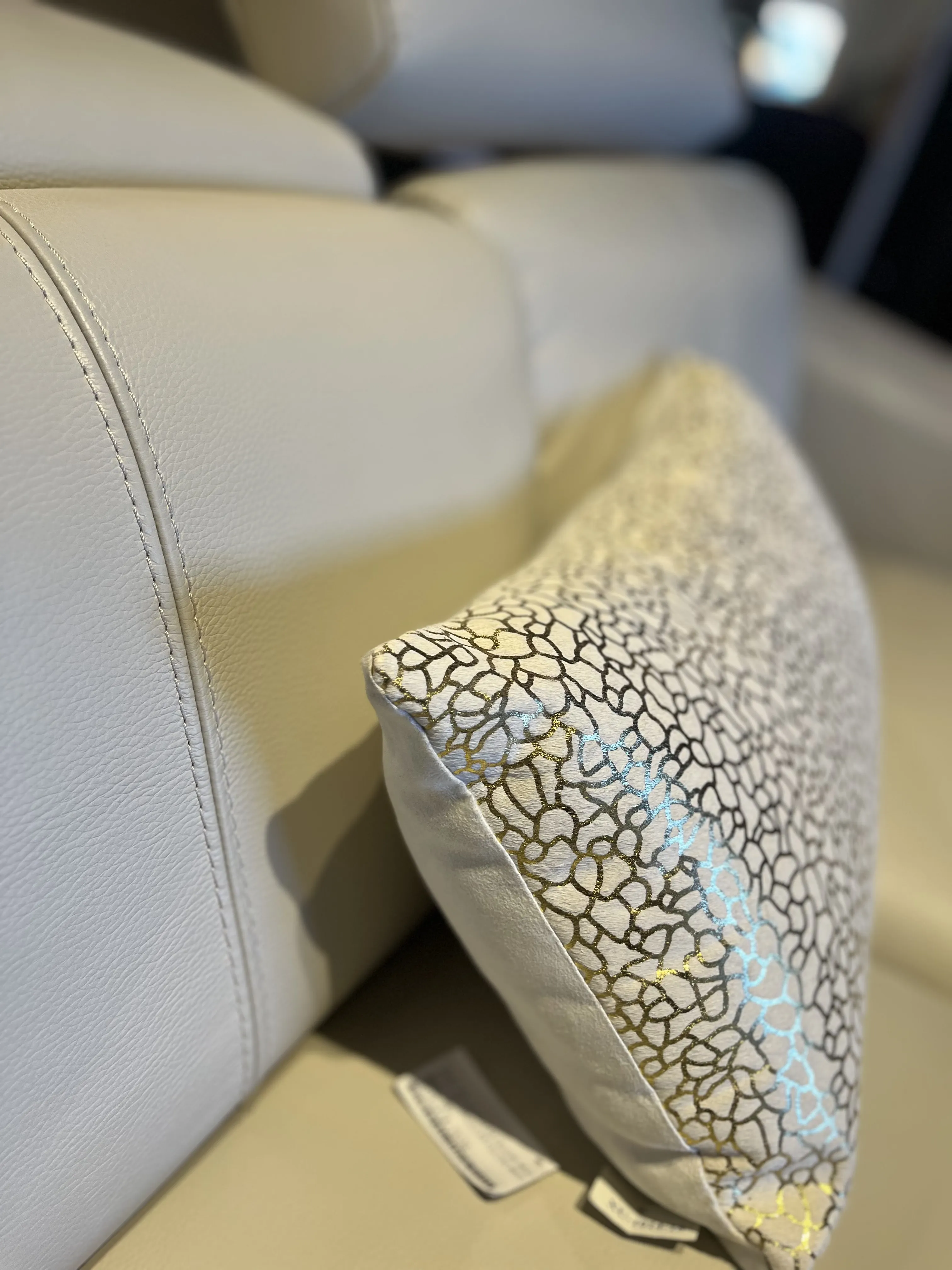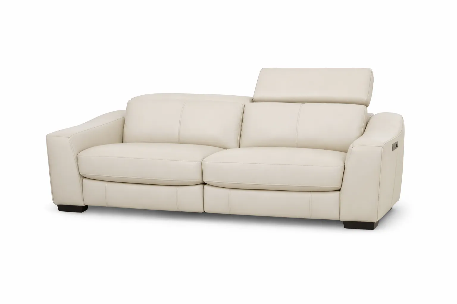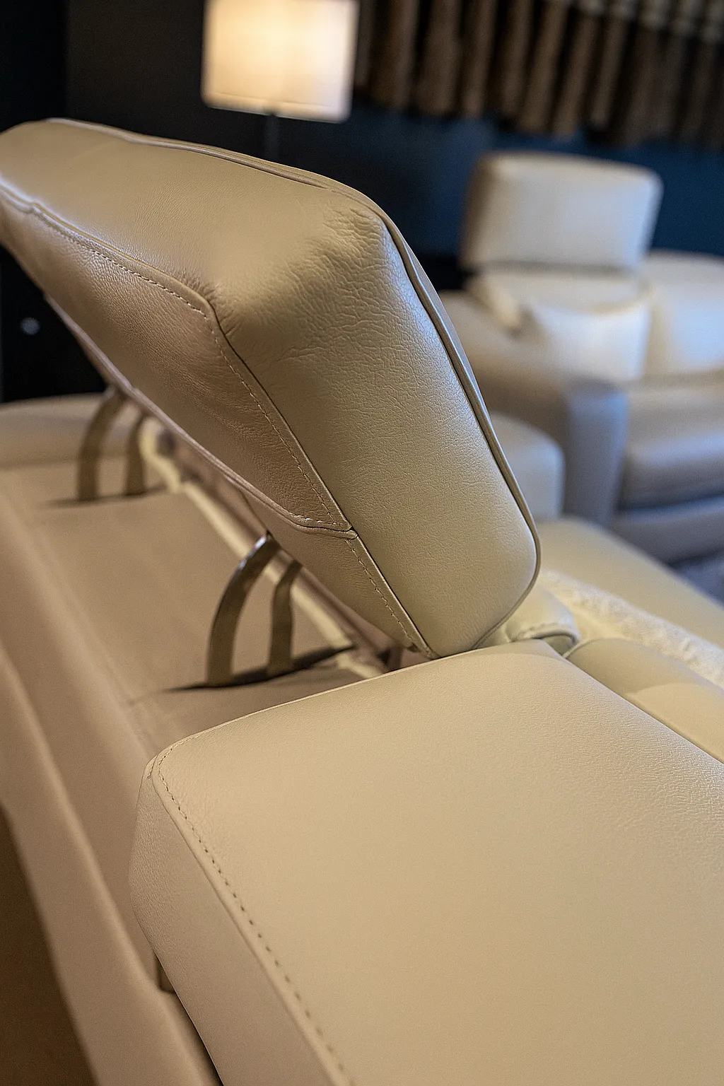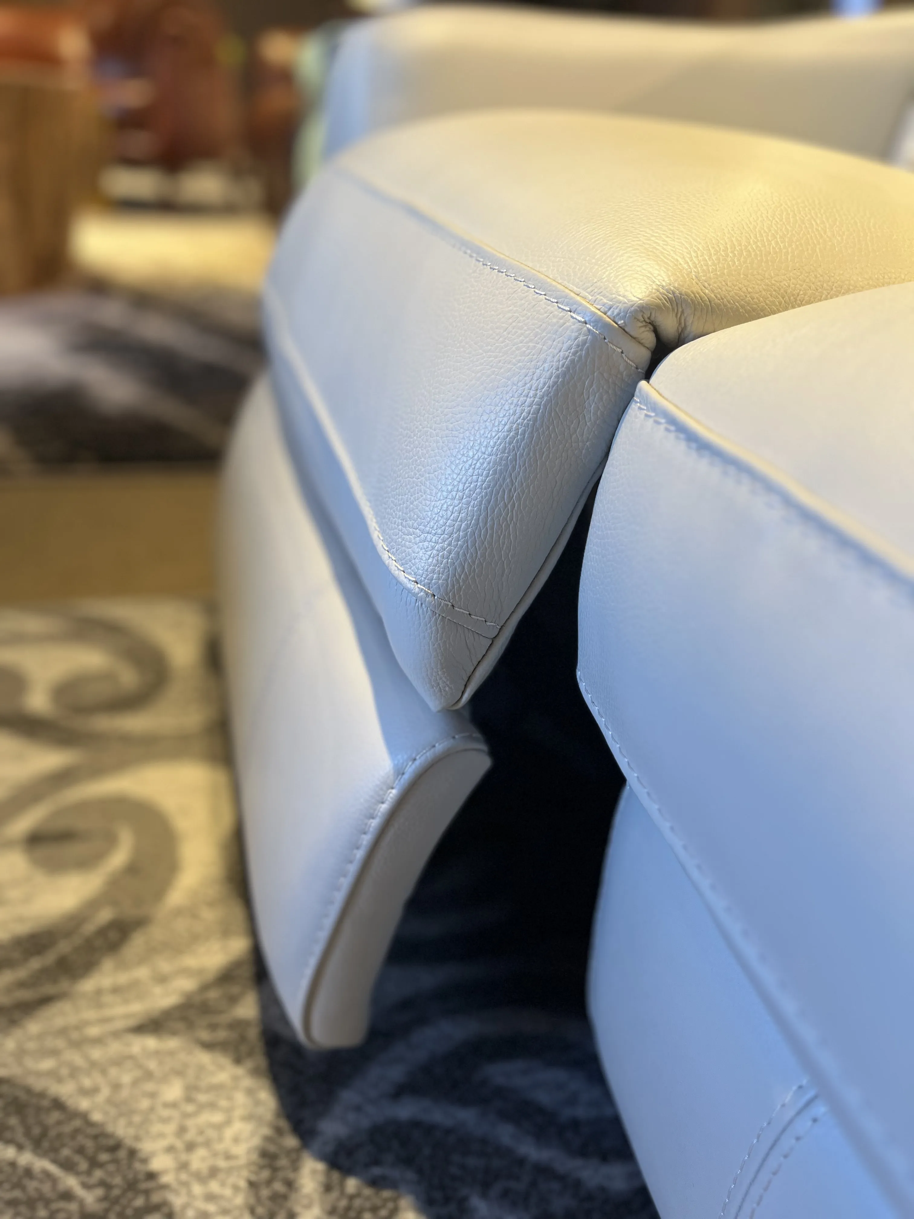 Upholstered in a soft frost color high-quality leather, it features adjustable headrests, smooth power recline functions, and a built-in phone charger for modern convenience.