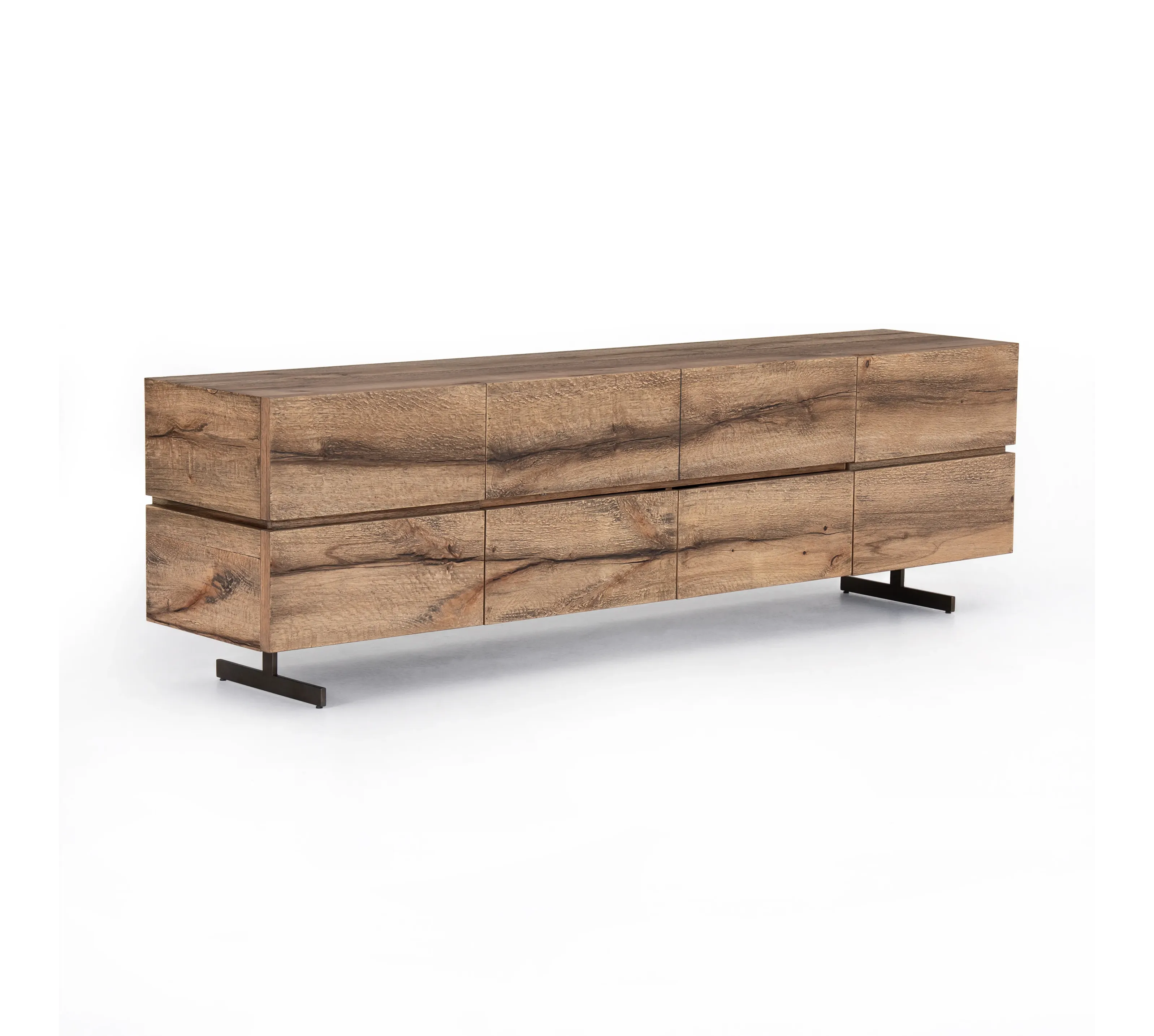 Made from reclaimed oak with modern iron legs, a stately, clean-lined console features horizontal recessing for a look of lightness with movement. Traditional door plus drop-down storage add a forward-thinking finishing touch. Rear cutouts for media cord management.